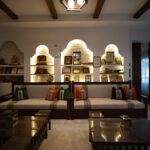 In the basement, we adopted an “organic modern” style, with a children’s play area featuring colorful illustrations and plants for a relaxing ambiance. The seating area used curved furniture and light wood, while the dining area was divided with wooden partitions. Bathrooms featured white marble, bronze sinks, and custom abaya closets. The children’s area had vibrant furniture and tailored bathrooms, while the driver’s room was furnished simply with practical elements.