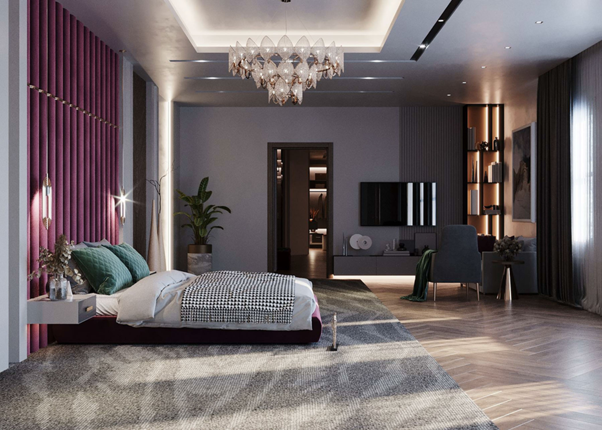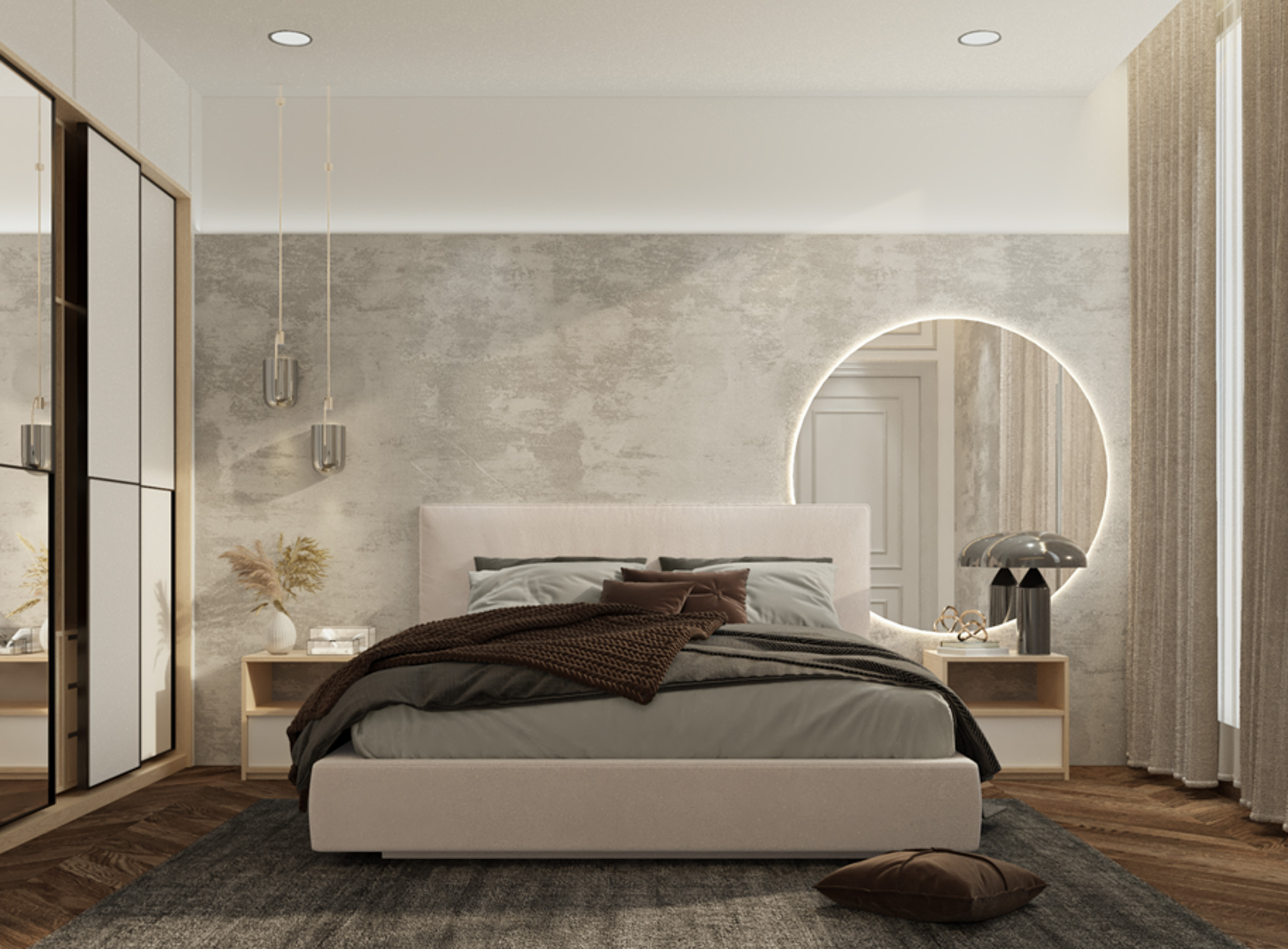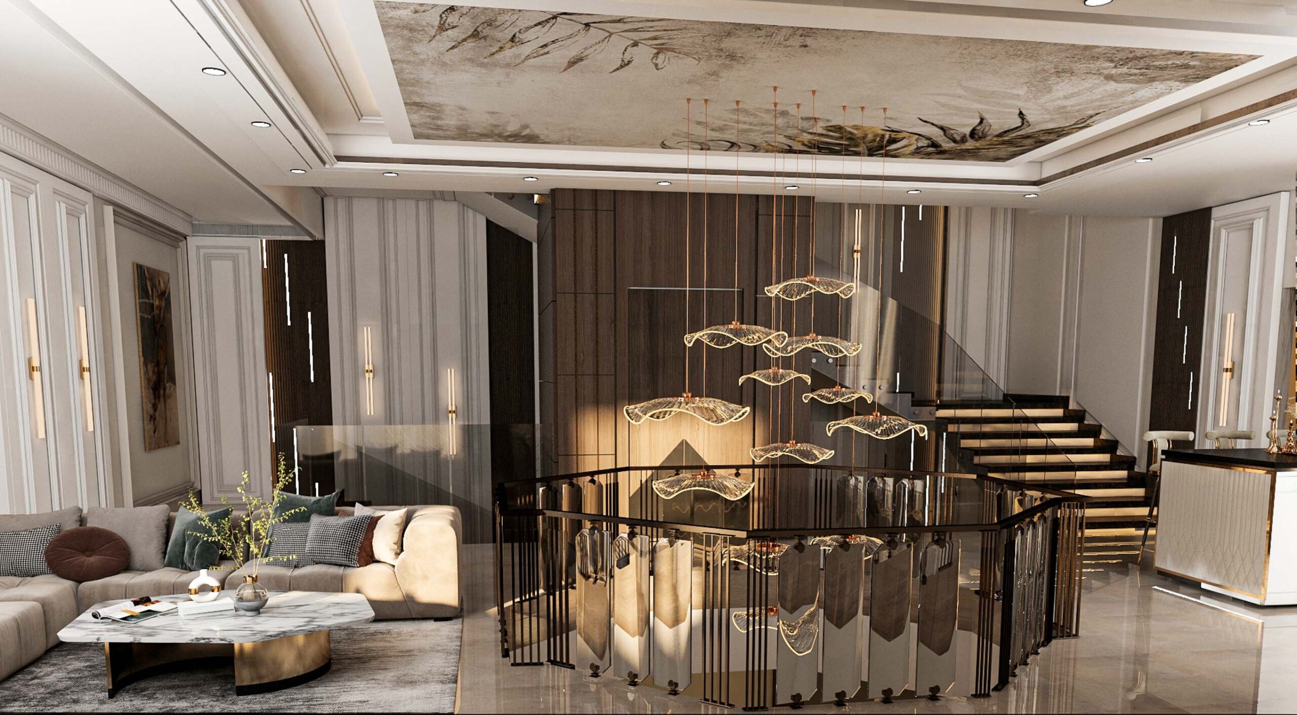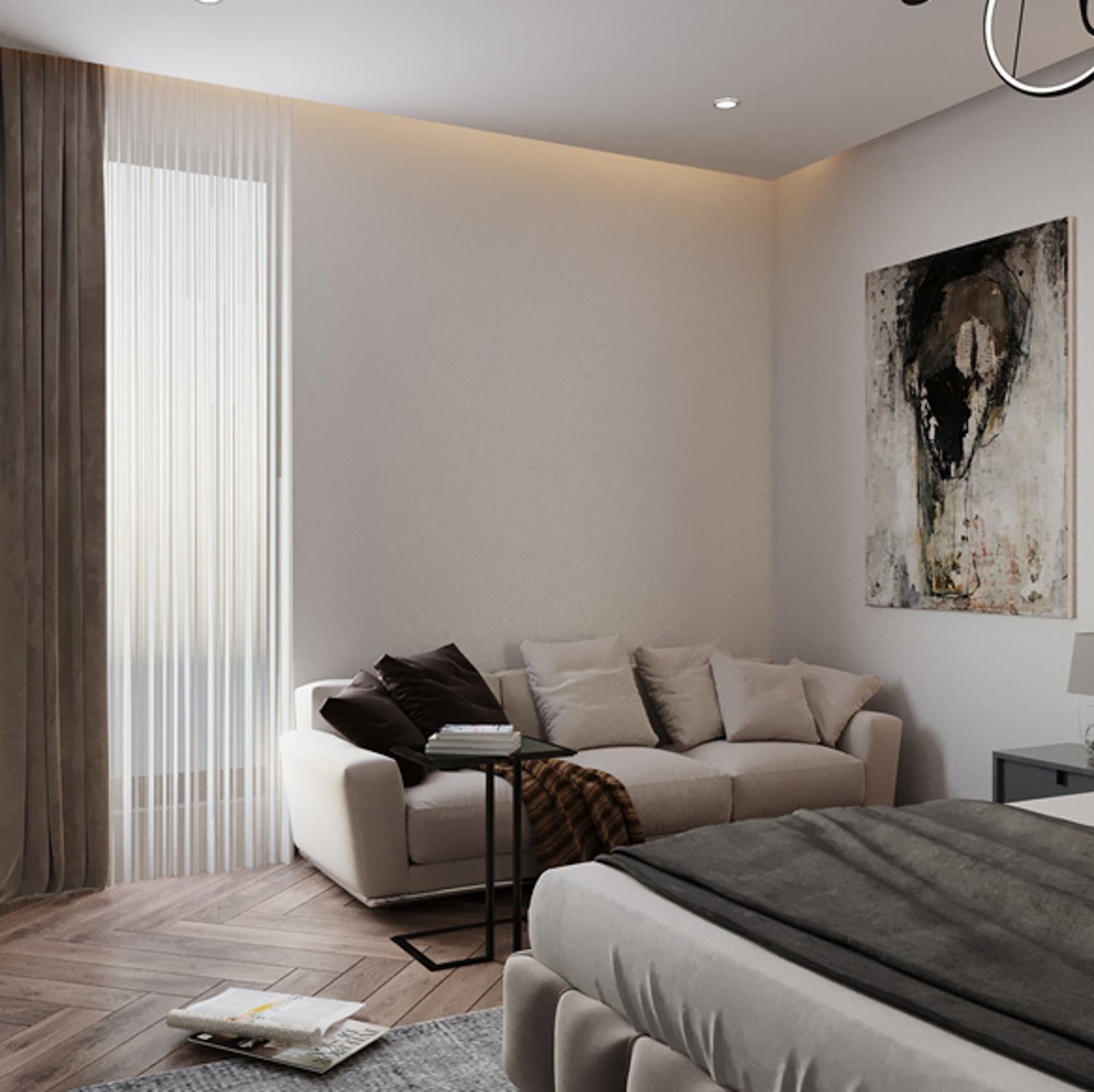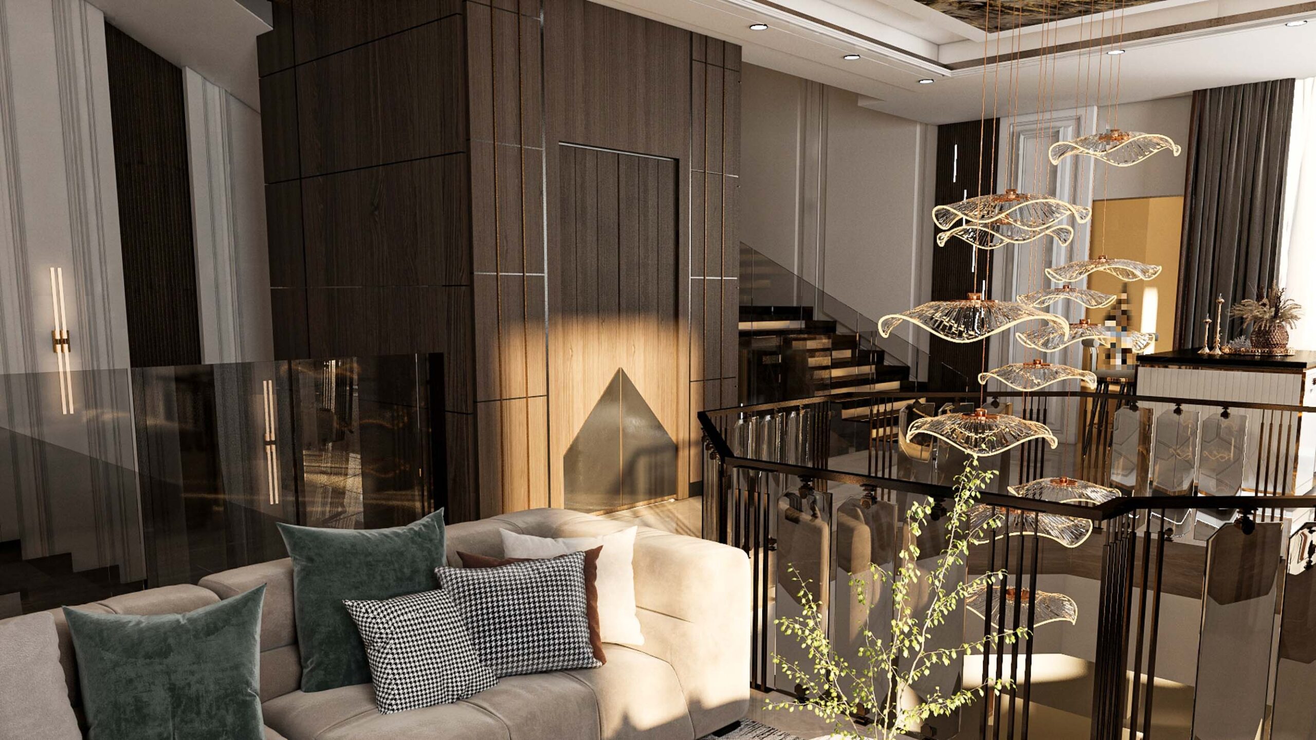 Bedrooms were designed with warm tones, textured walls, and artistic accents, while bathrooms combined marble and wood for elegance. On the top floor, concealed lighting, artwork, and textured walls created a refined feel, with the rooftop and gym featuring wooden furniture and pergolas with greenery for shade and beauty.