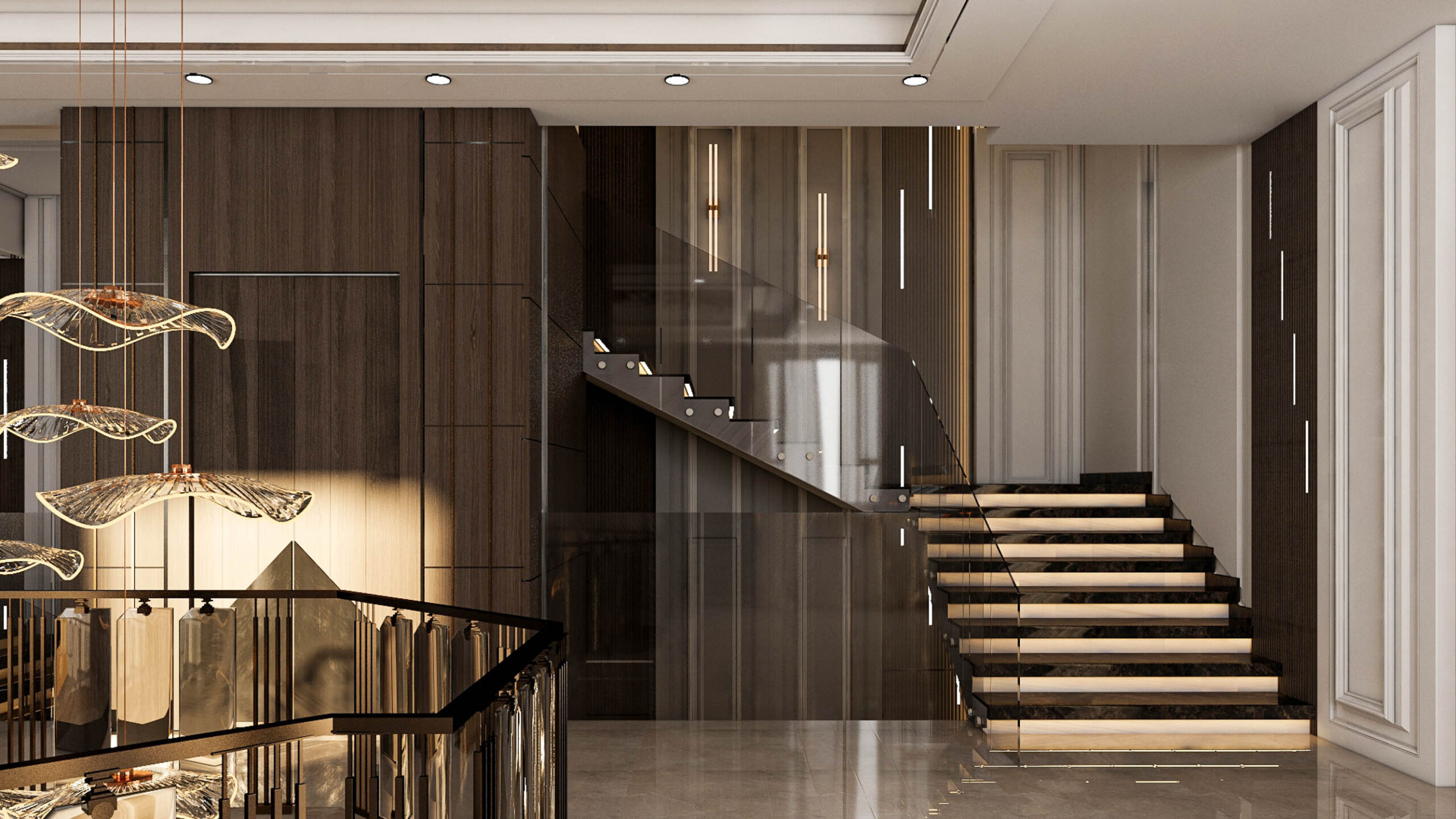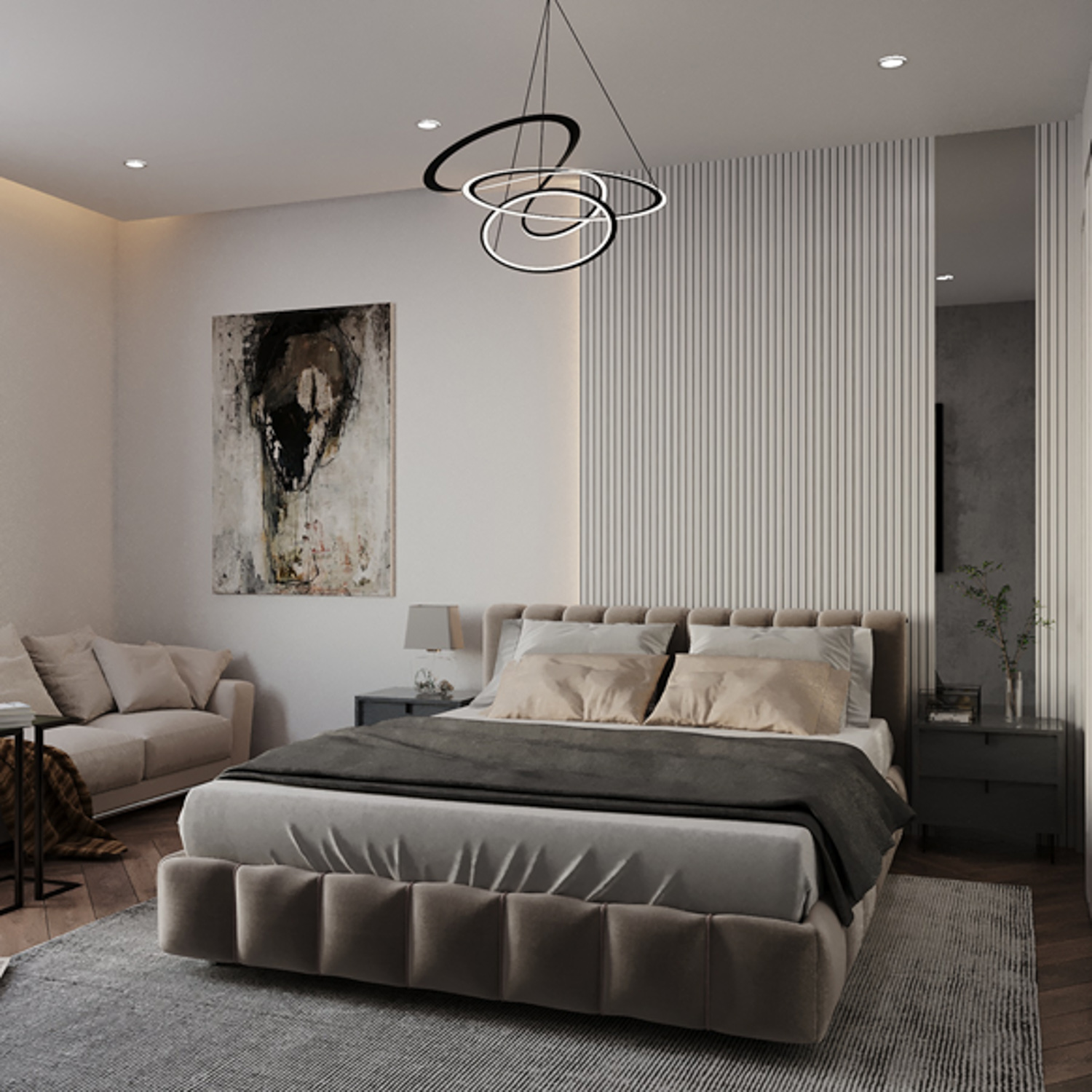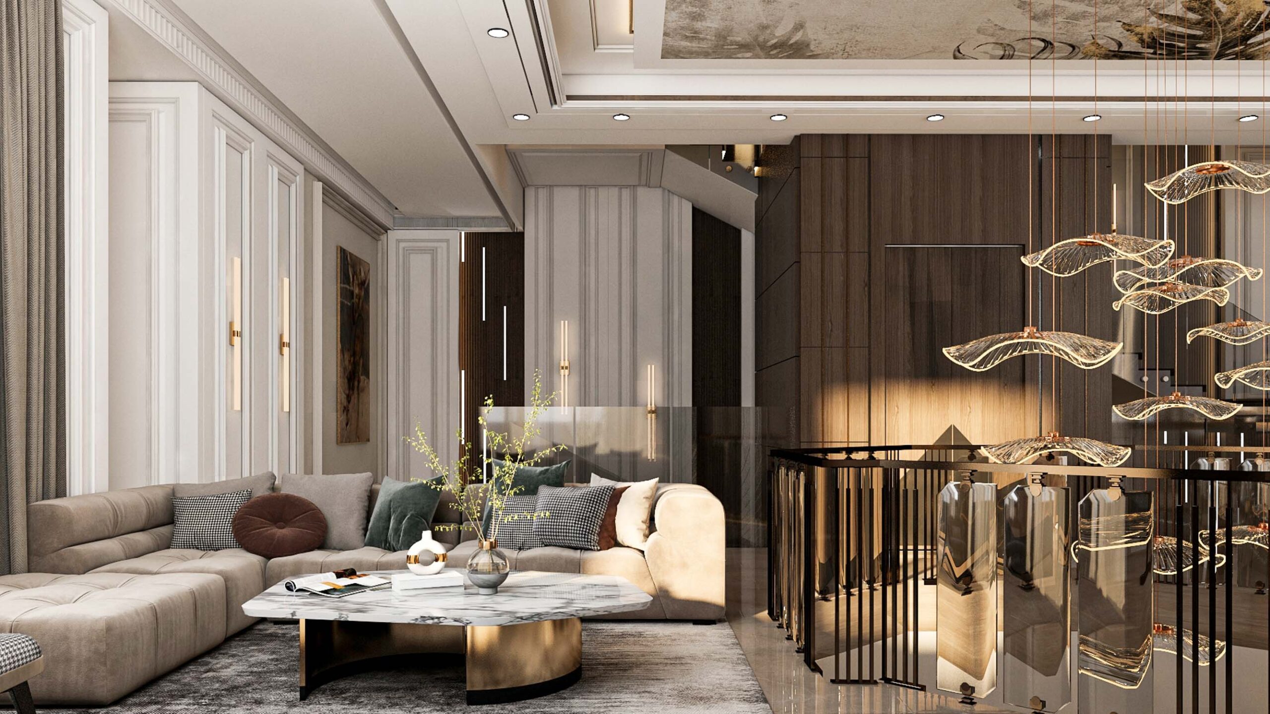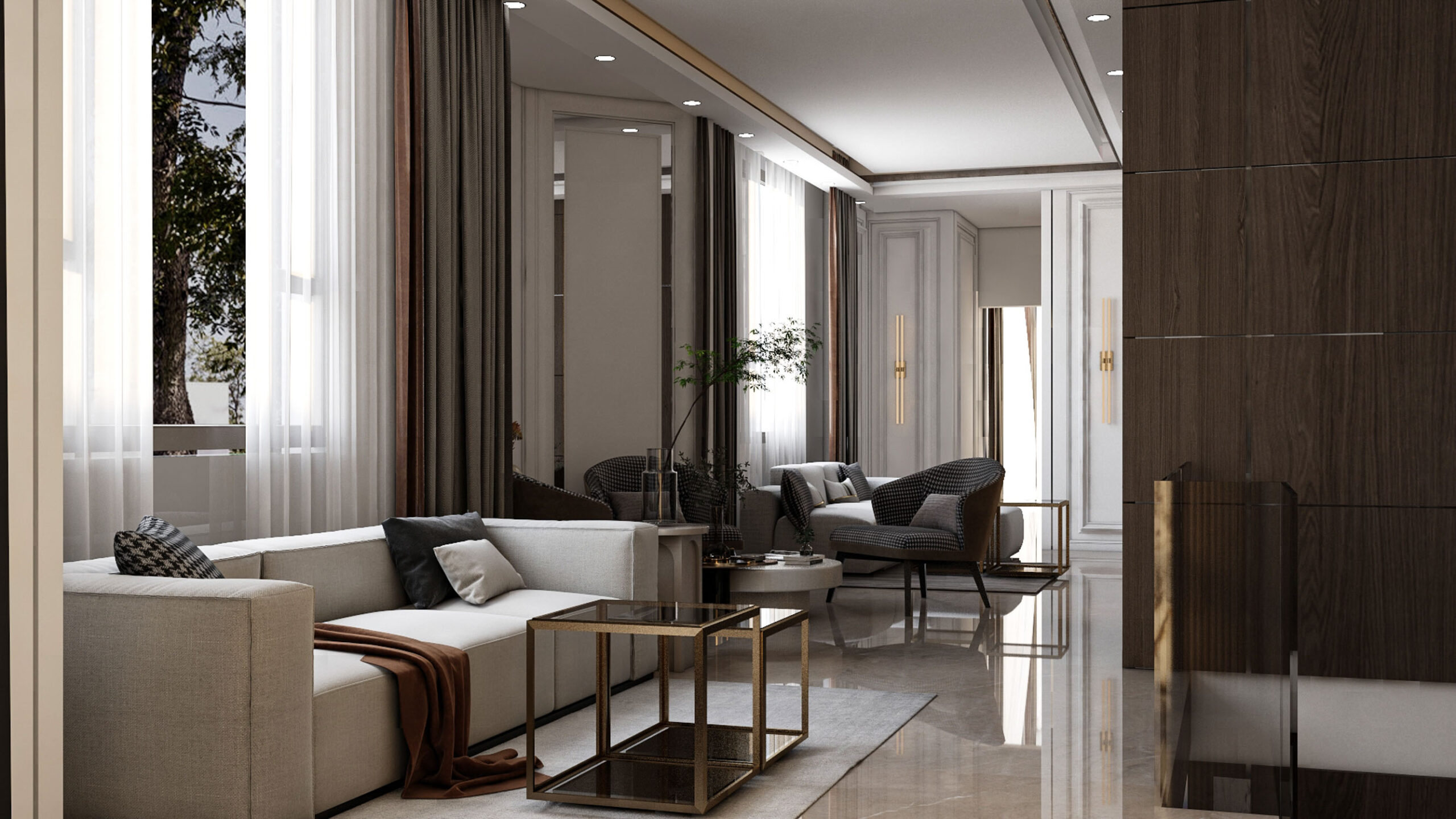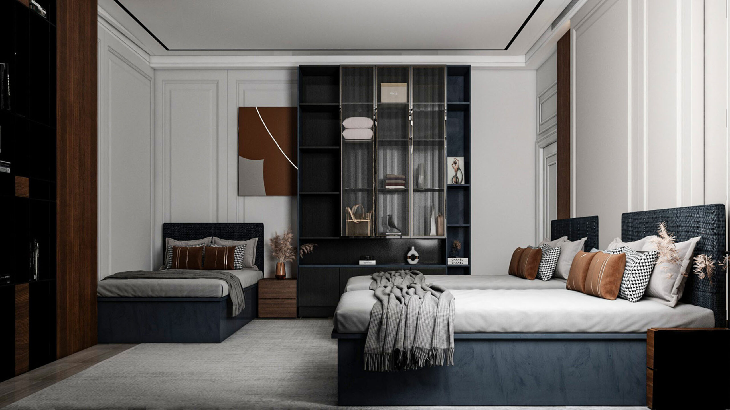 Bedrooms were designed with warm tones, textured walls, and artistic accents, while bathrooms combined marble and wood for elegance. On the top floor, concealed lighting, artwork, and textured walls created a refined feel, with the rooftop and gym featuring wooden furniture and pergolas with greenery for shade and beauty.