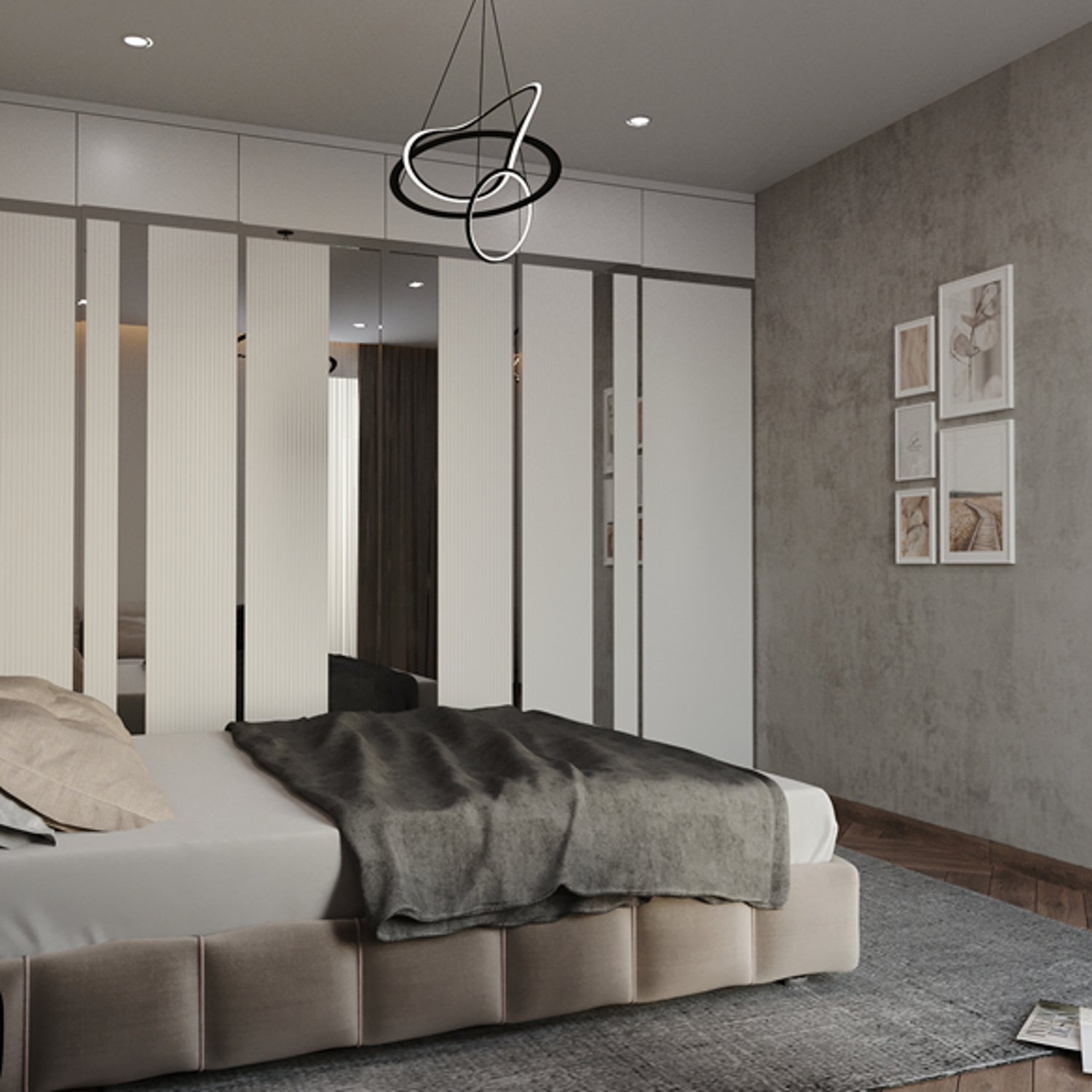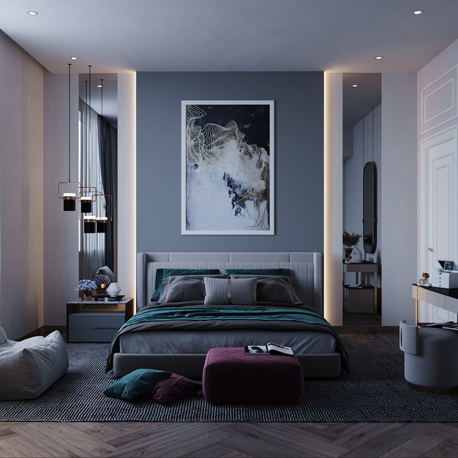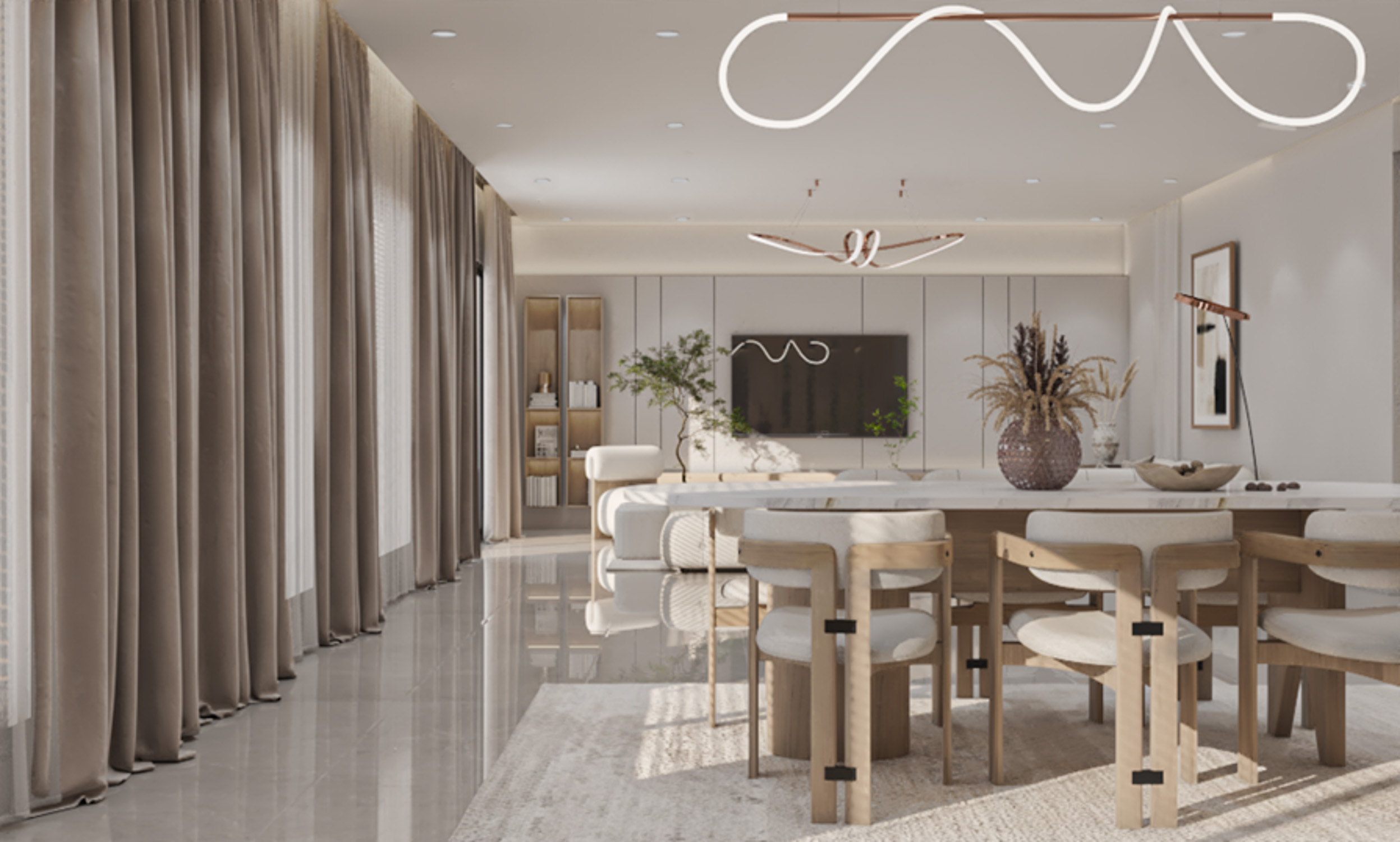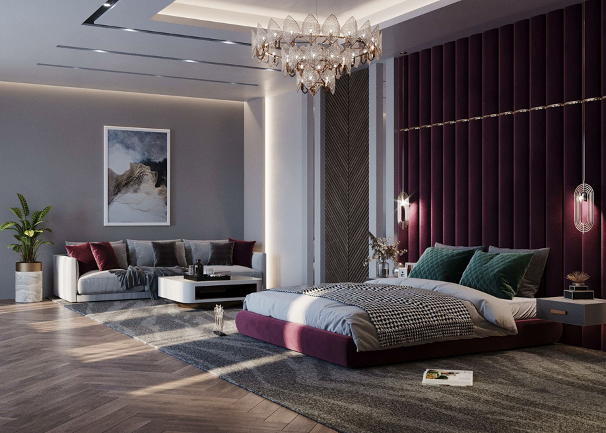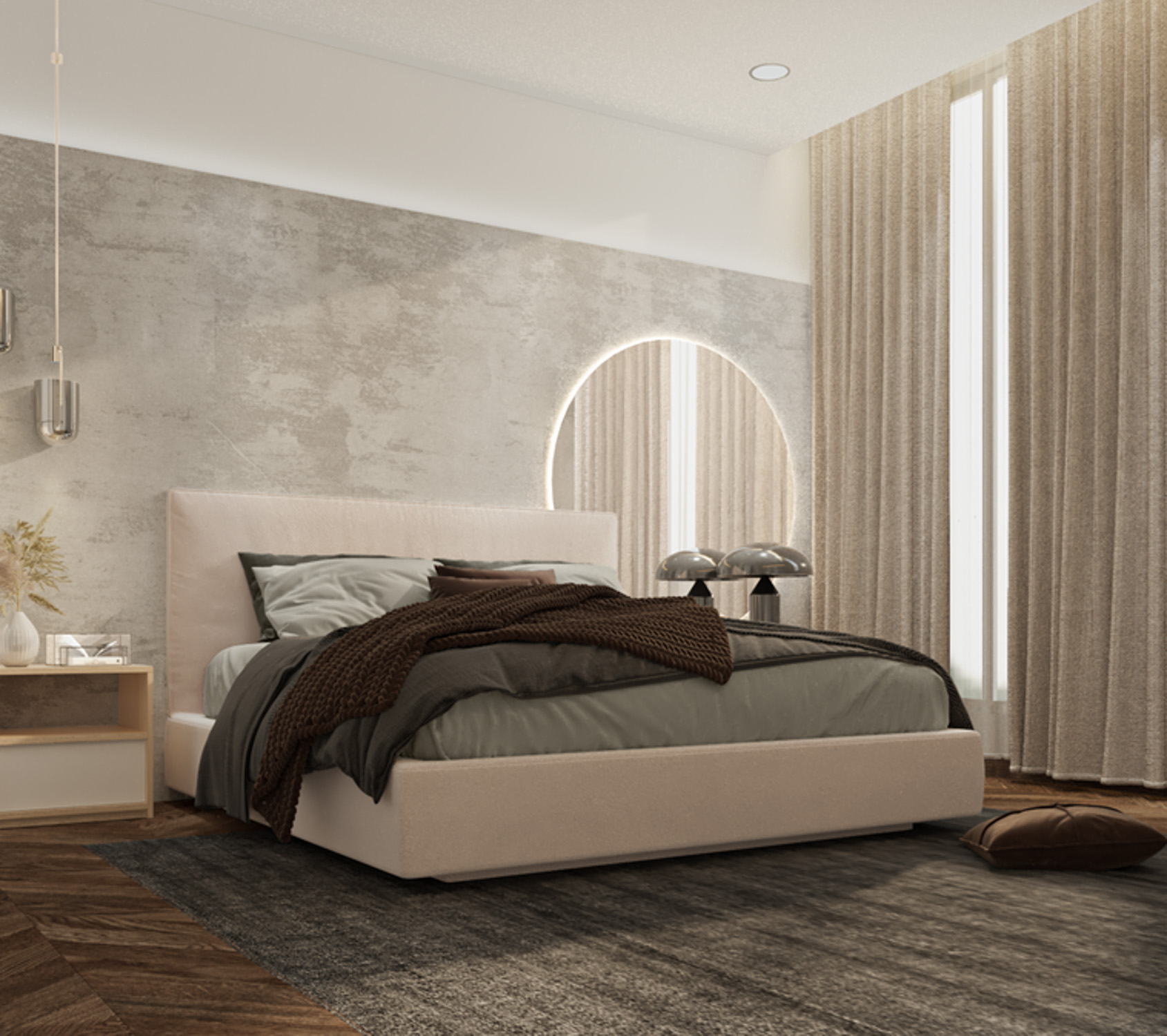 Bedrooms were designed with warm tones, textured walls, and artistic accents, while bathrooms combined marble and wood for elegance. On the top floor, concealed lighting, artwork, and textured walls created a refined feel, with the rooftop and gym featuring wooden furniture and pergolas with greenery for shade and beauty.