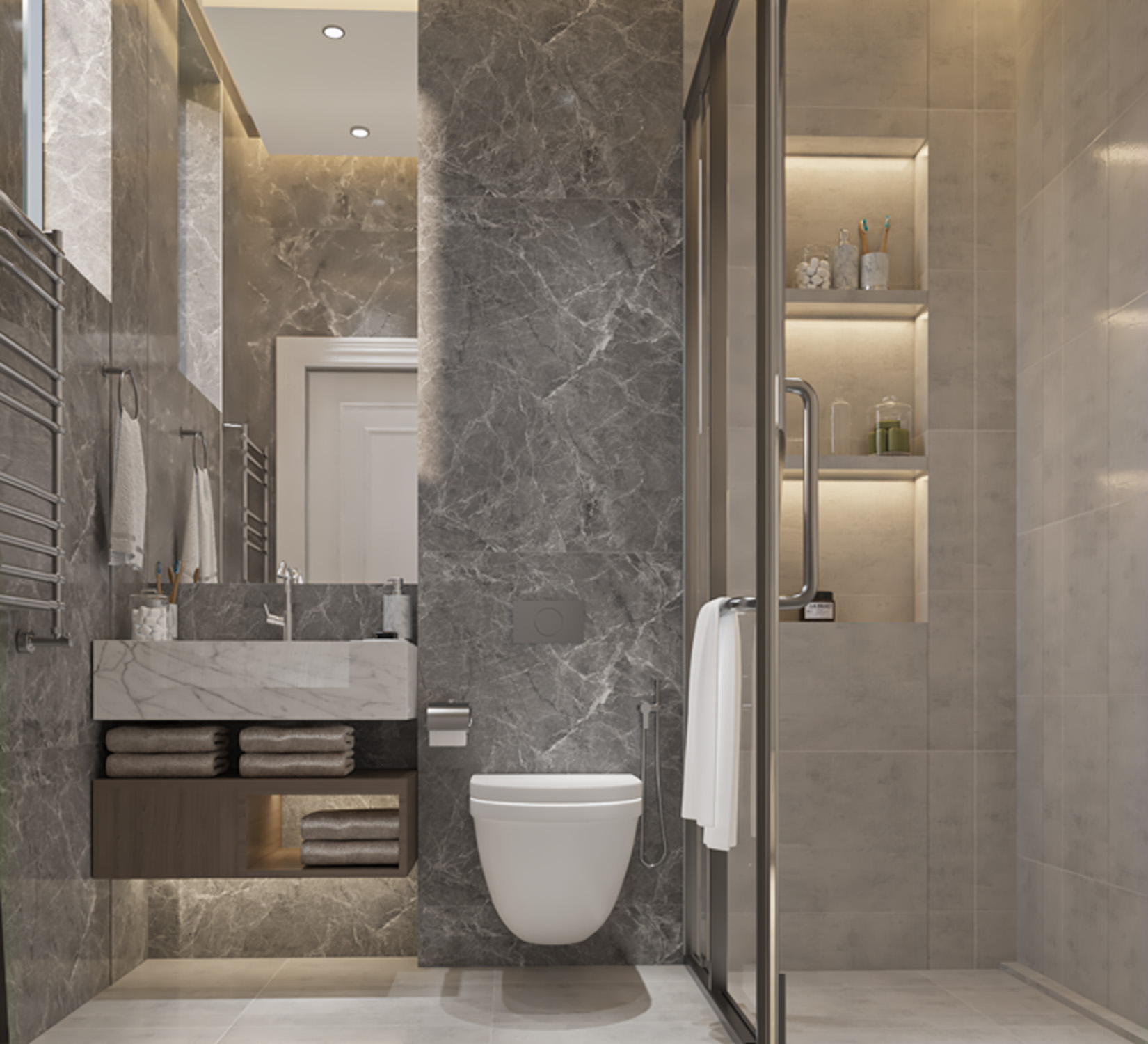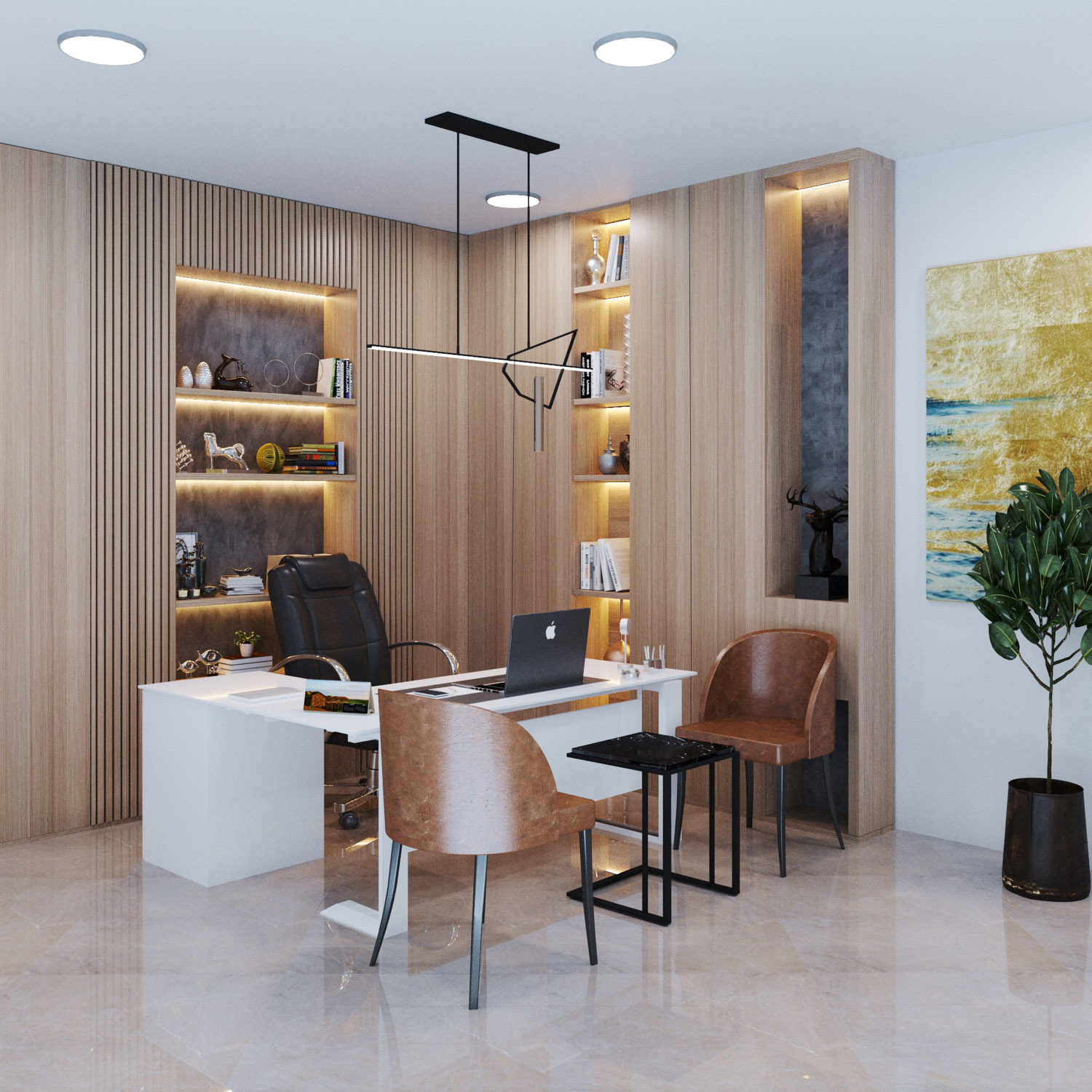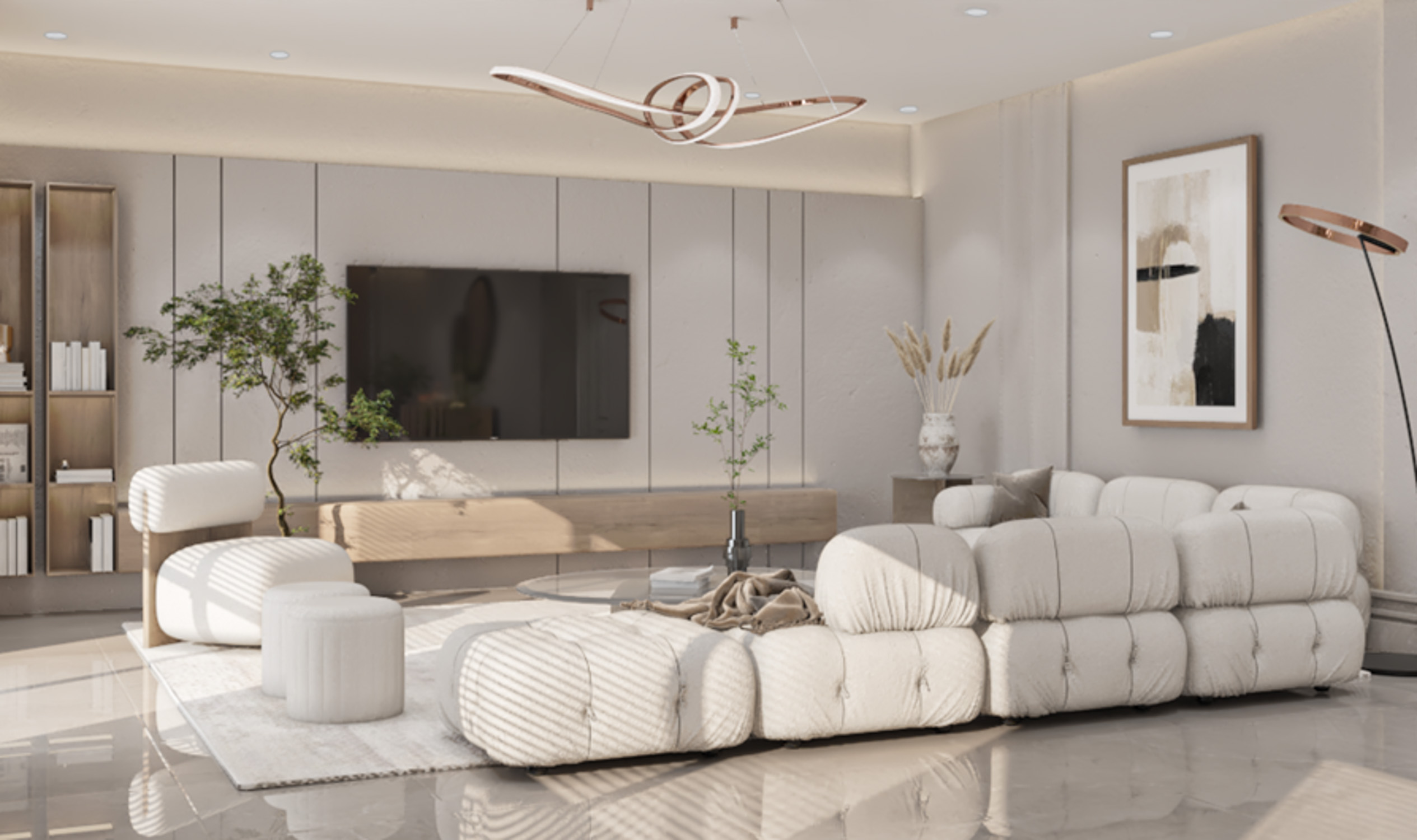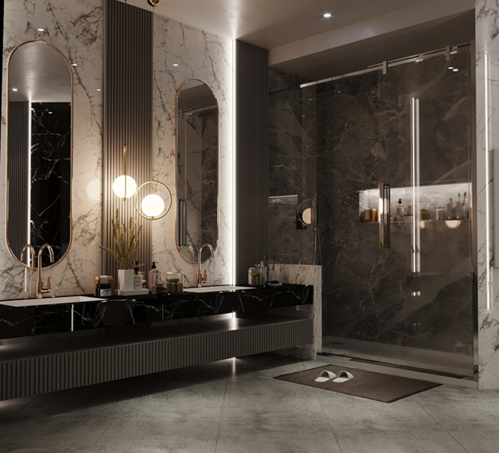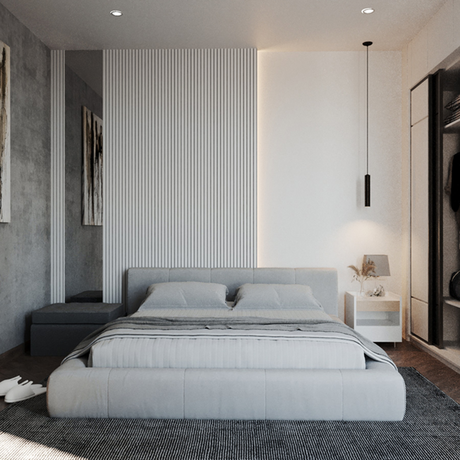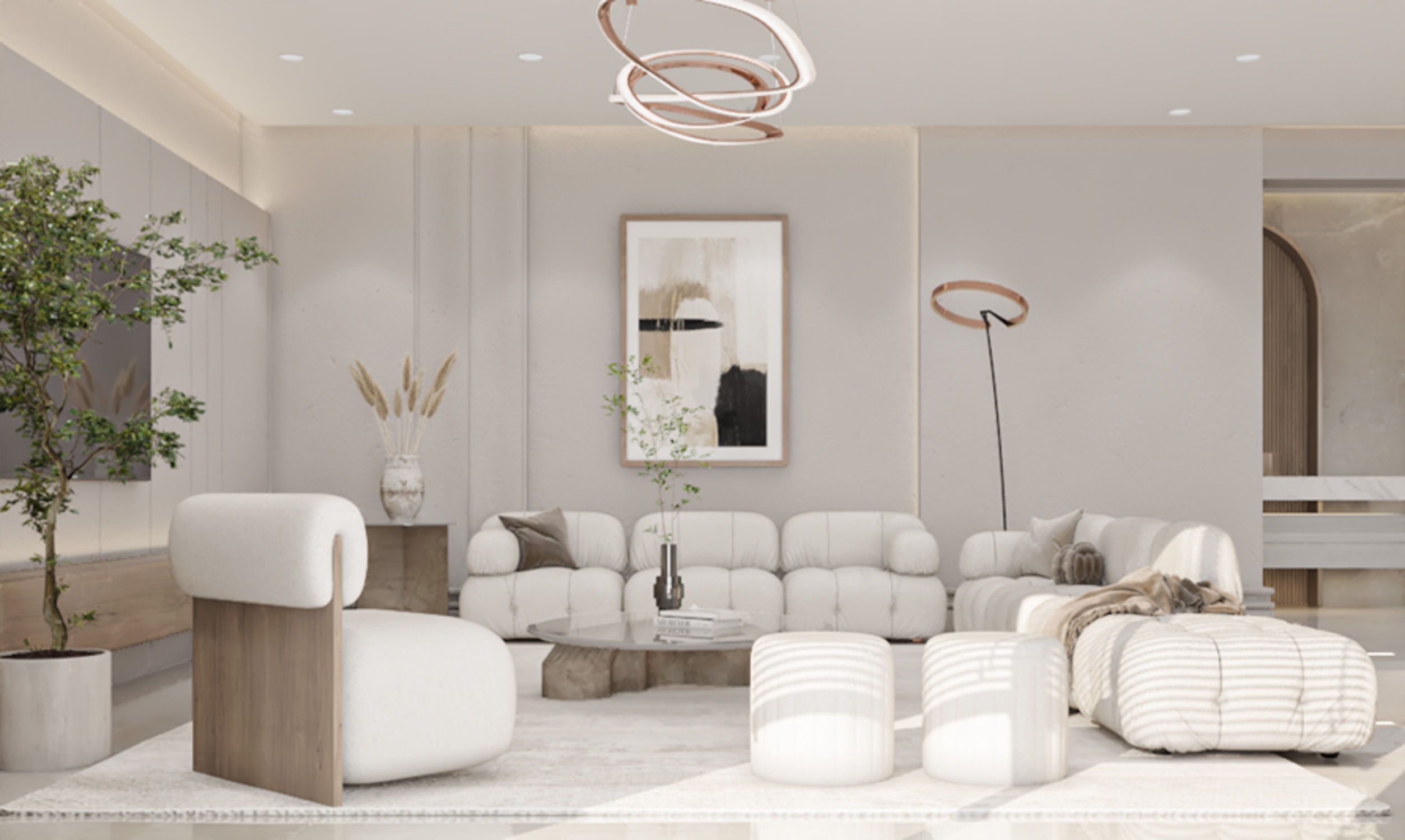 Bedrooms were designed with warm tones, textured walls, and artistic accents, while bathrooms combined marble and wood for elegance. On the top floor, concealed lighting, artwork, and textured walls created a refined feel, with the rooftop and gym featuring wooden furniture and pergolas with greenery for shade and beauty.
