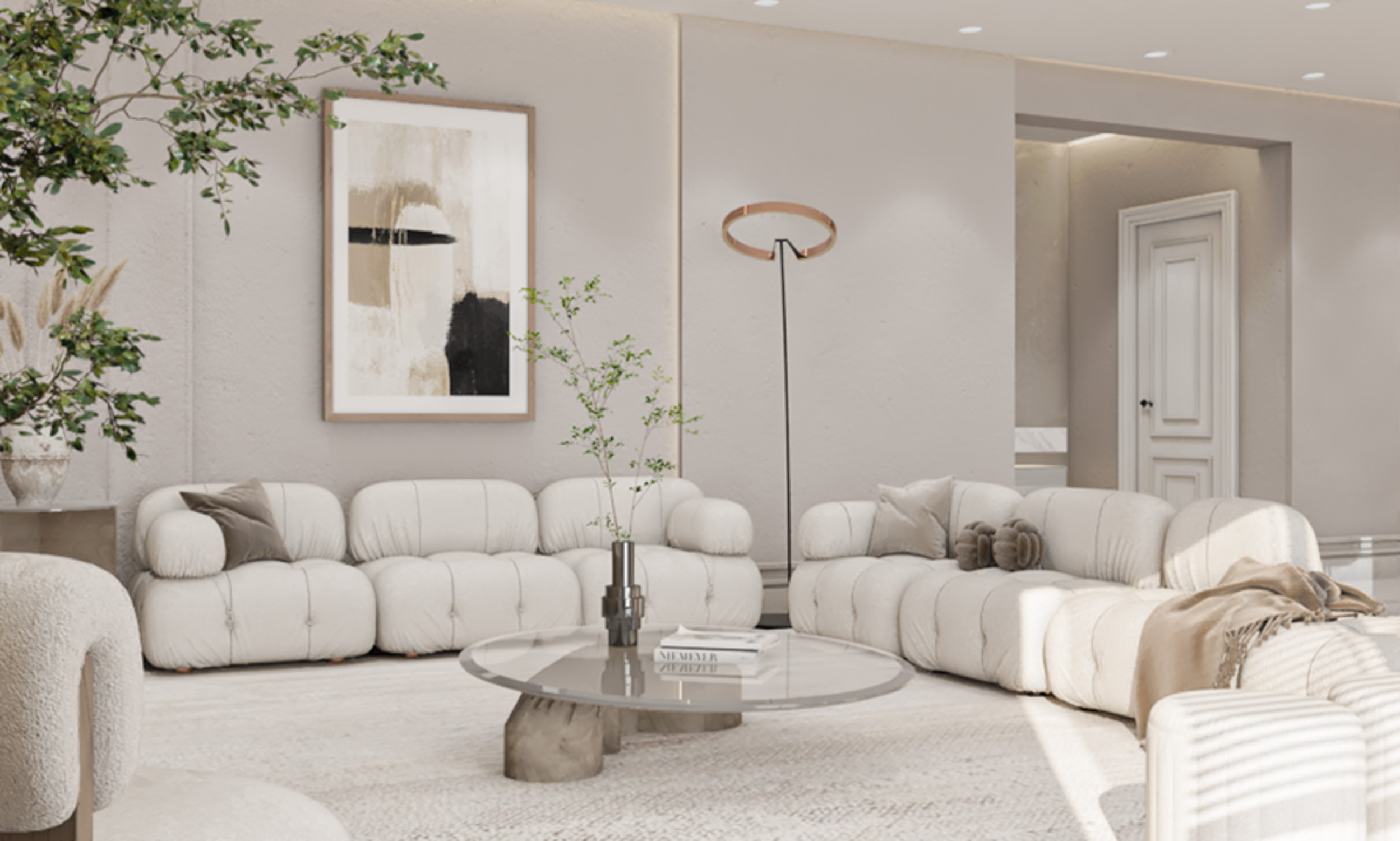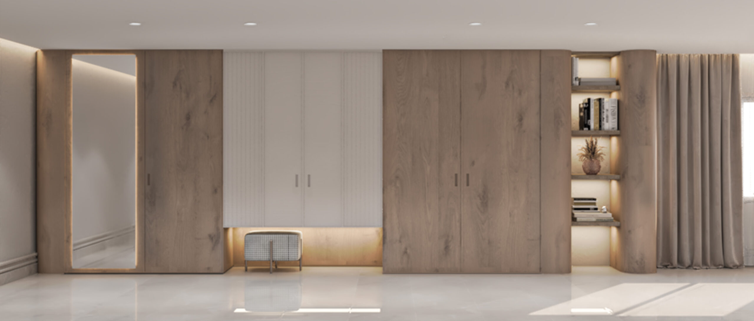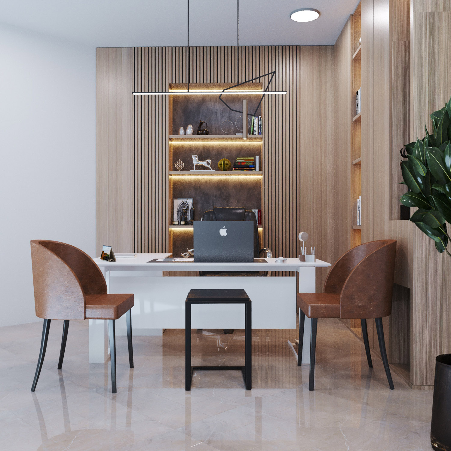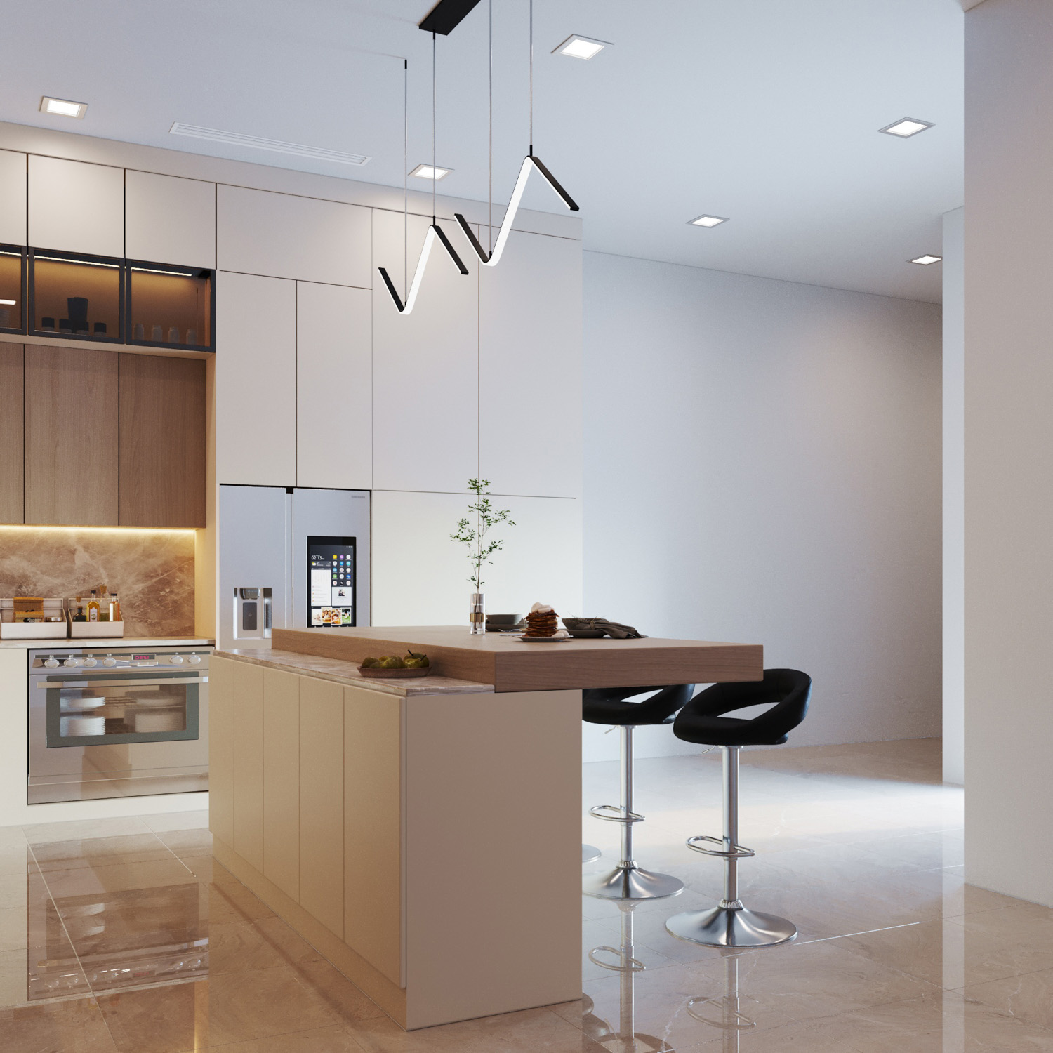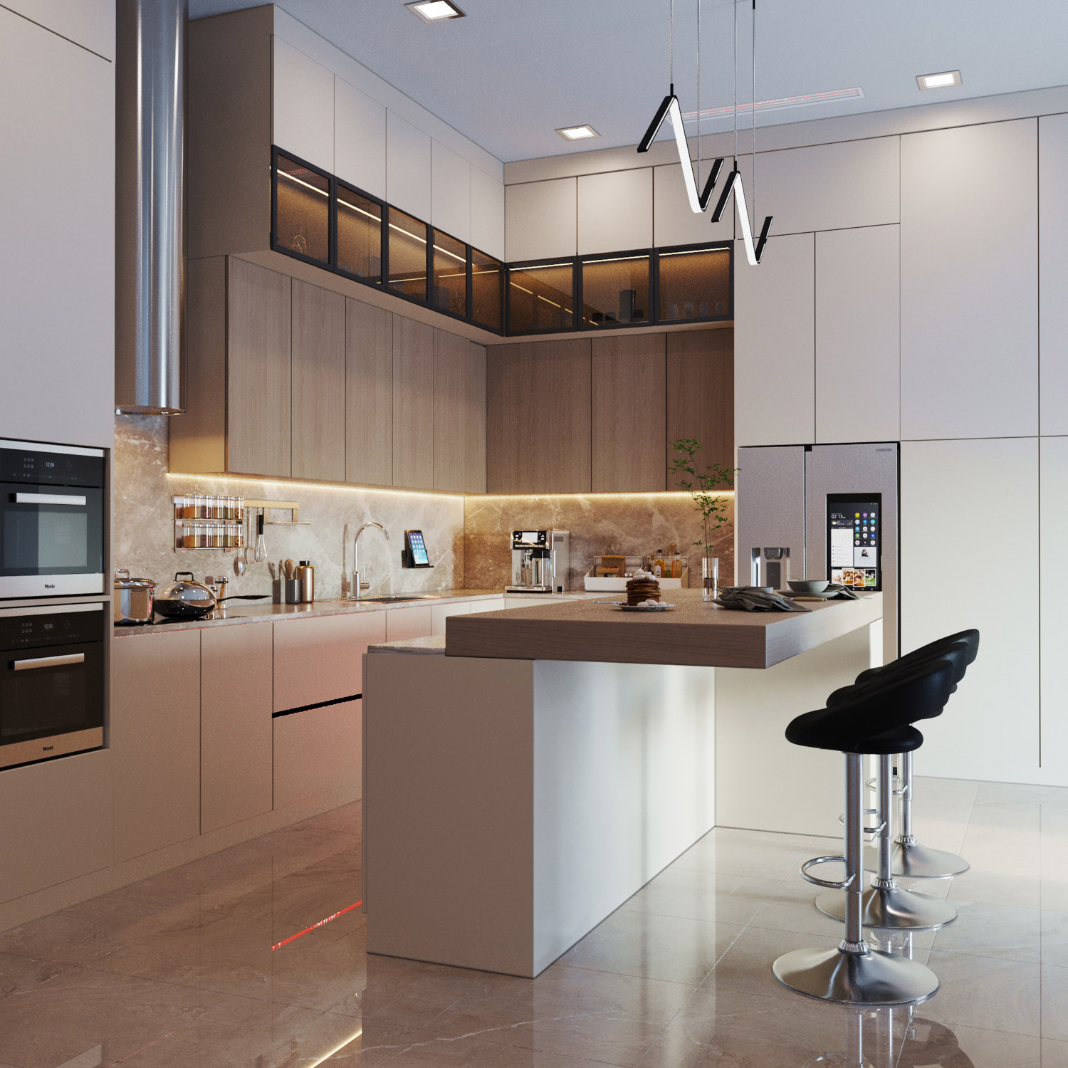Bedrooms were designed with warm tones, textured walls, and artistic accents, while bathrooms combined marble and wood for elegance. On the top floor, concealed lighting, artwork, and textured walls created a refined feel, with the rooftop and gym featuring wooden furniture and pergolas with greenery for shade and beauty.