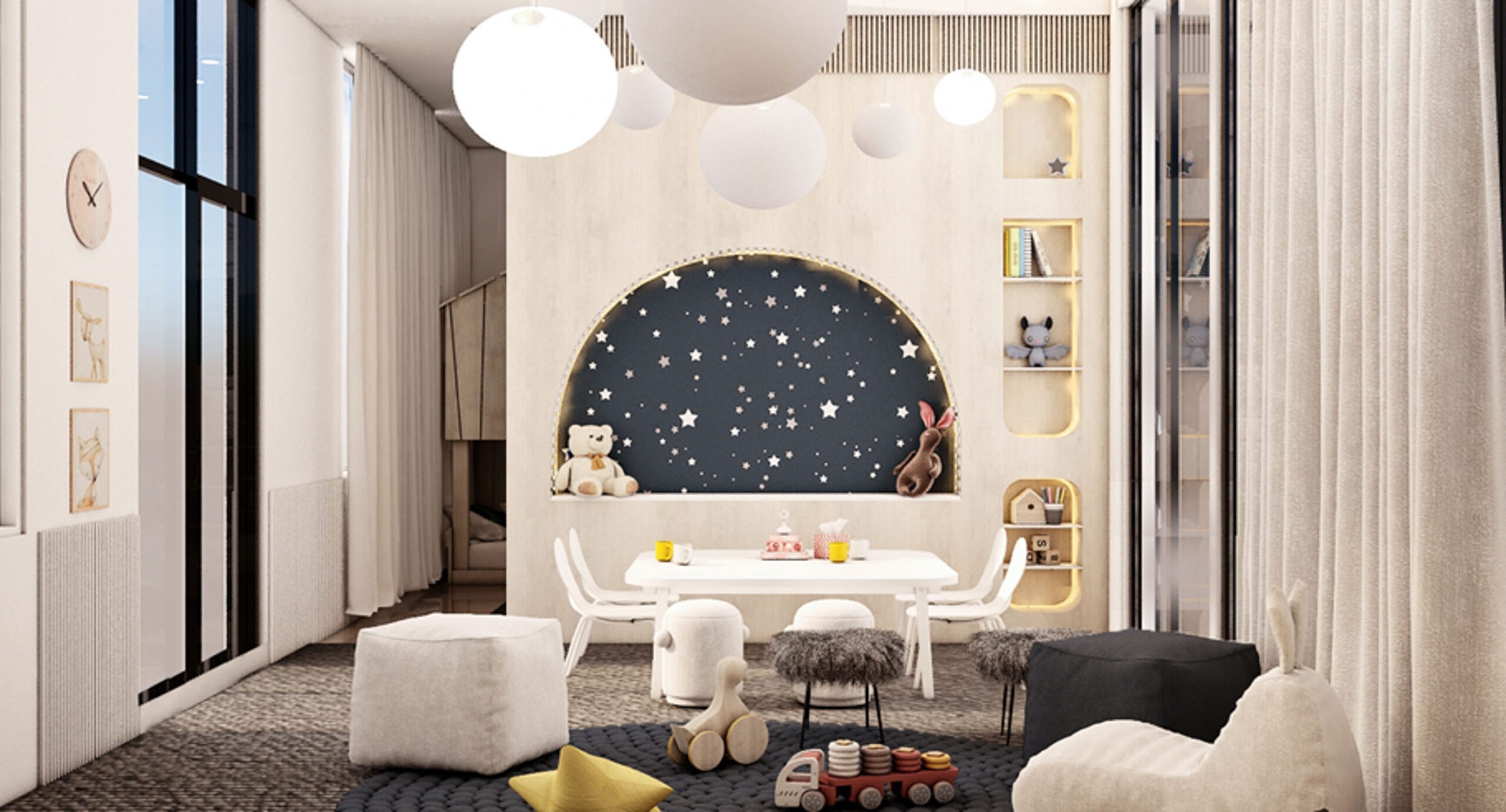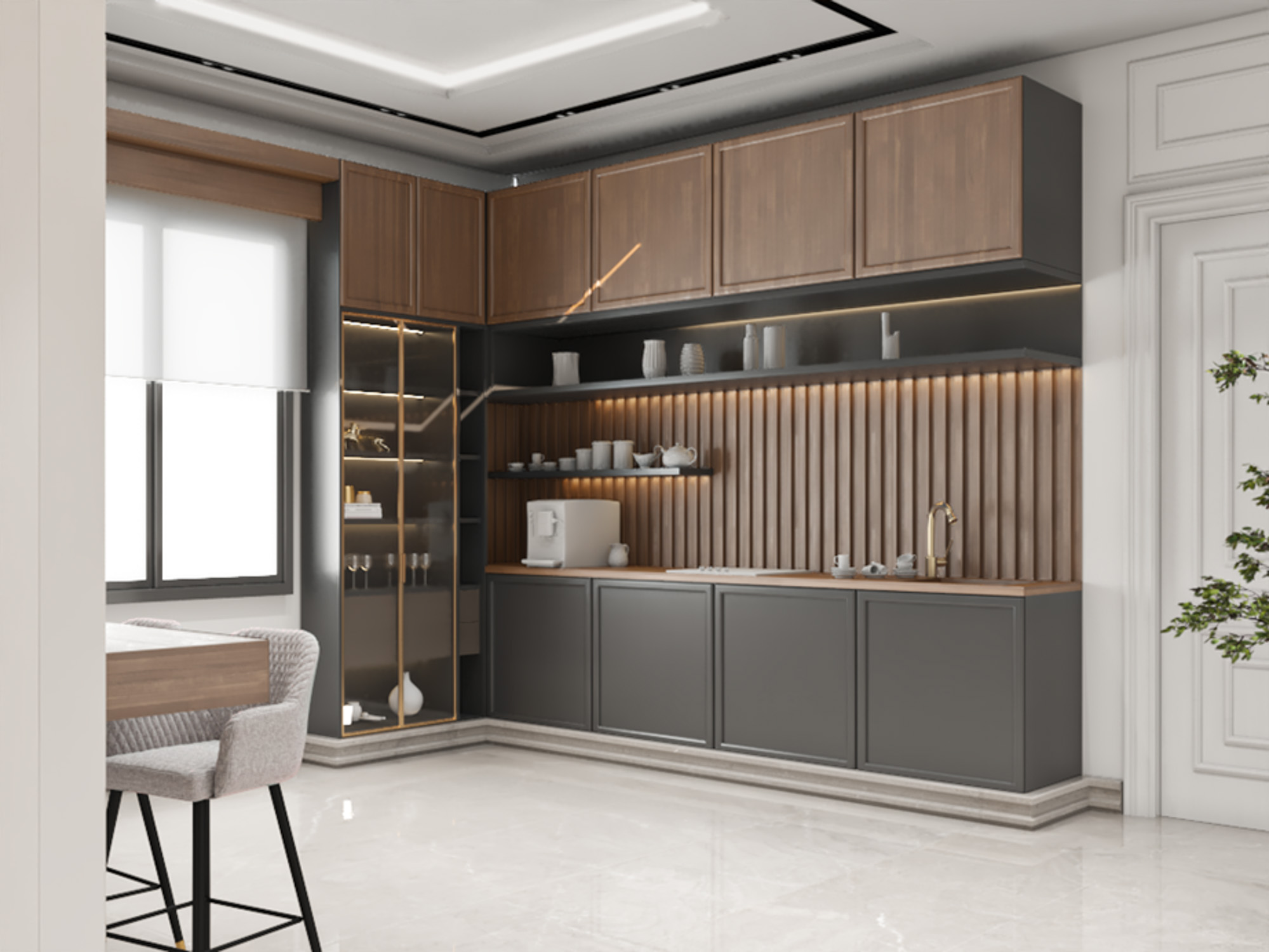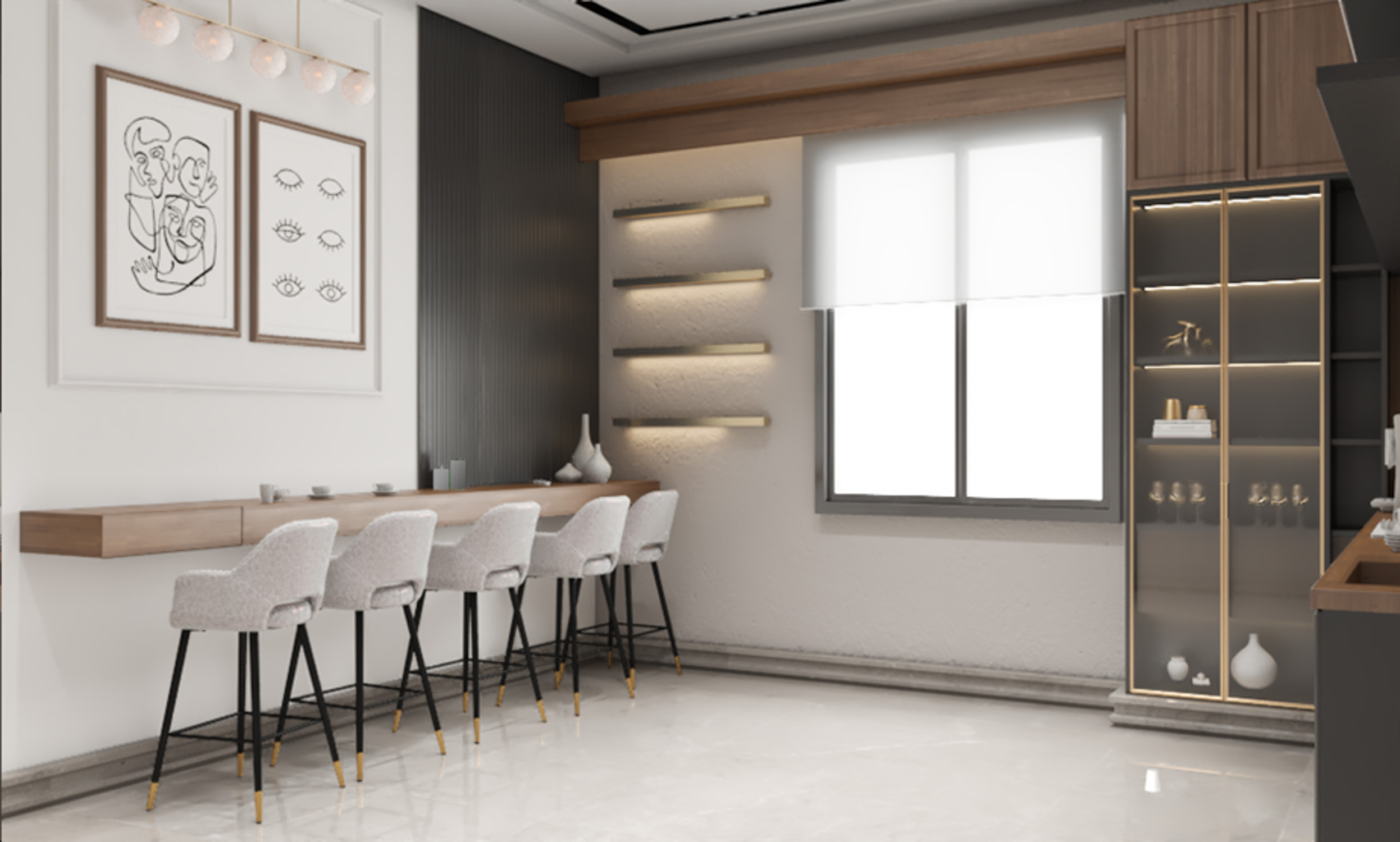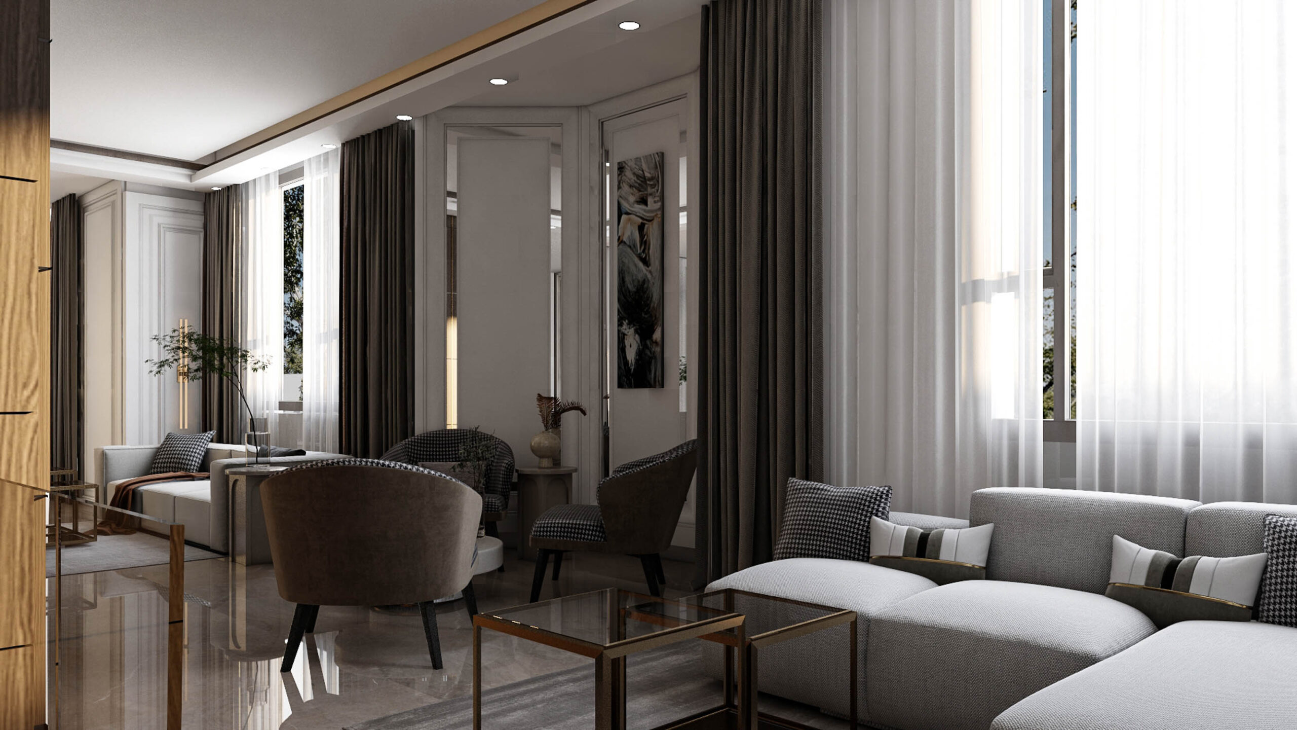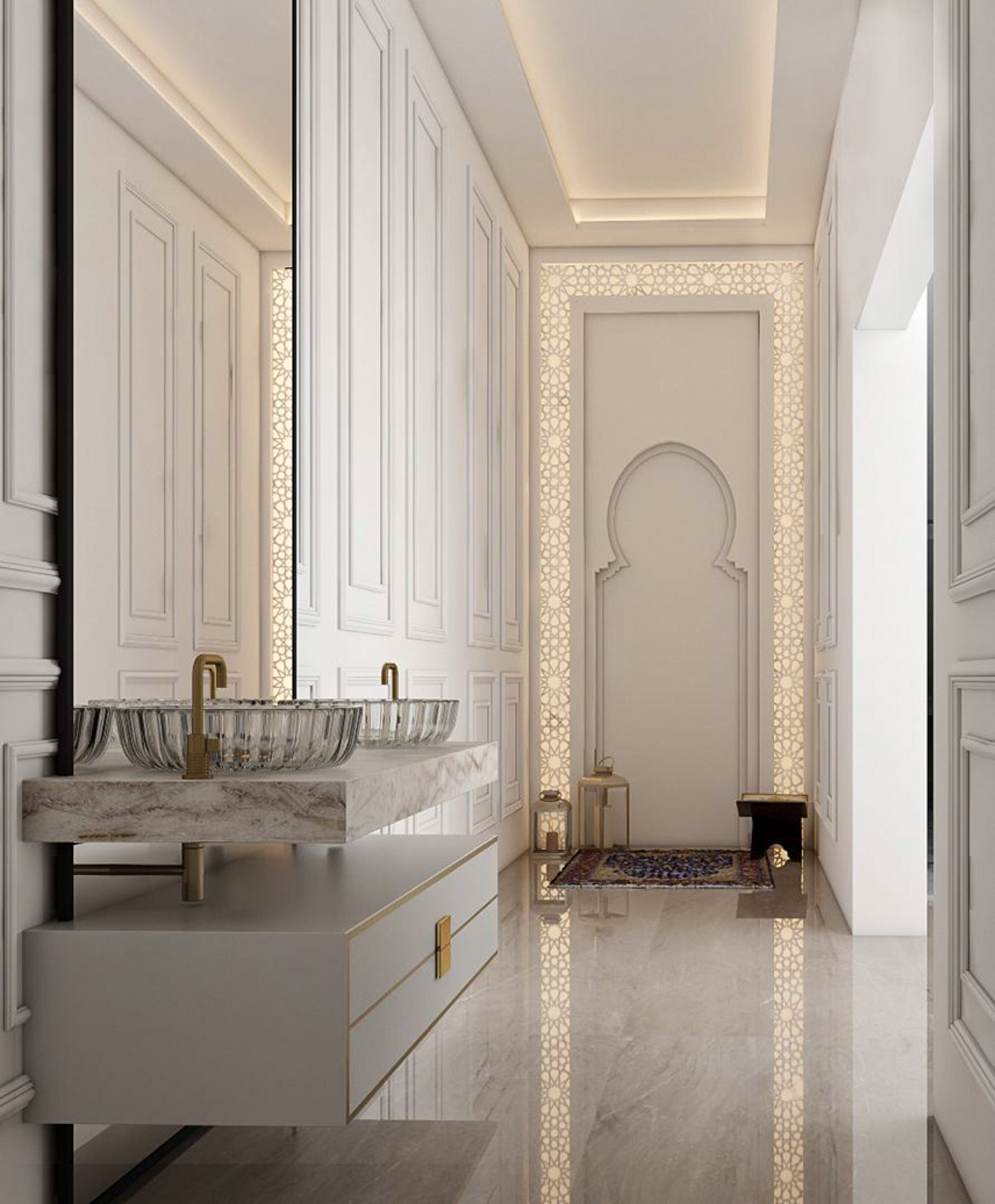 In the basement, we adopted an “organic modern” style, with a children’s play area featuring colorful illustrations and plants for a relaxing ambiance. The seating area used curved furniture and light wood, while the dining area was divided with wooden partitions. Bathrooms featured white marble, bronze sinks, and custom abaya closets. The children’s area had vibrant furniture and tailored bathrooms, while the driver’s room was furnished simply with practical elements.