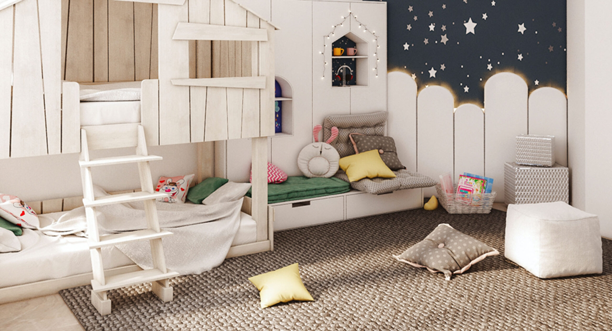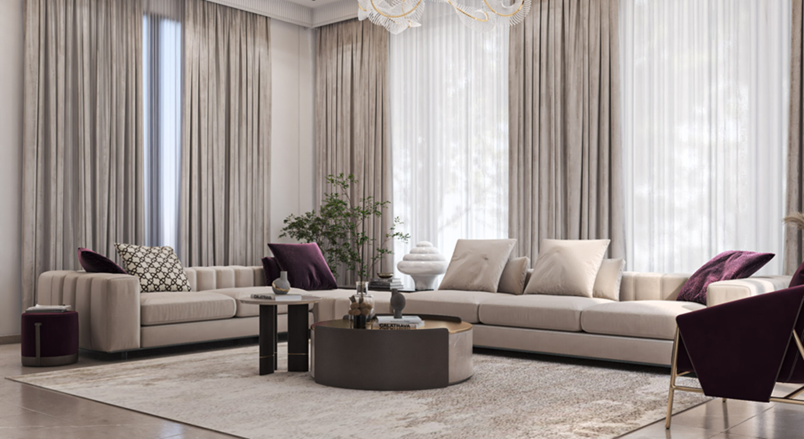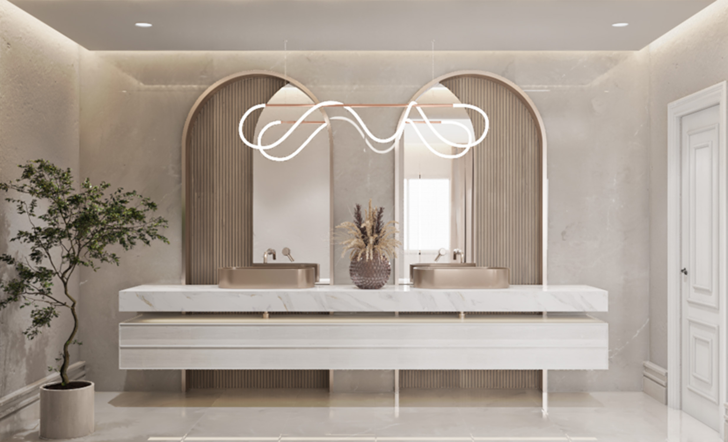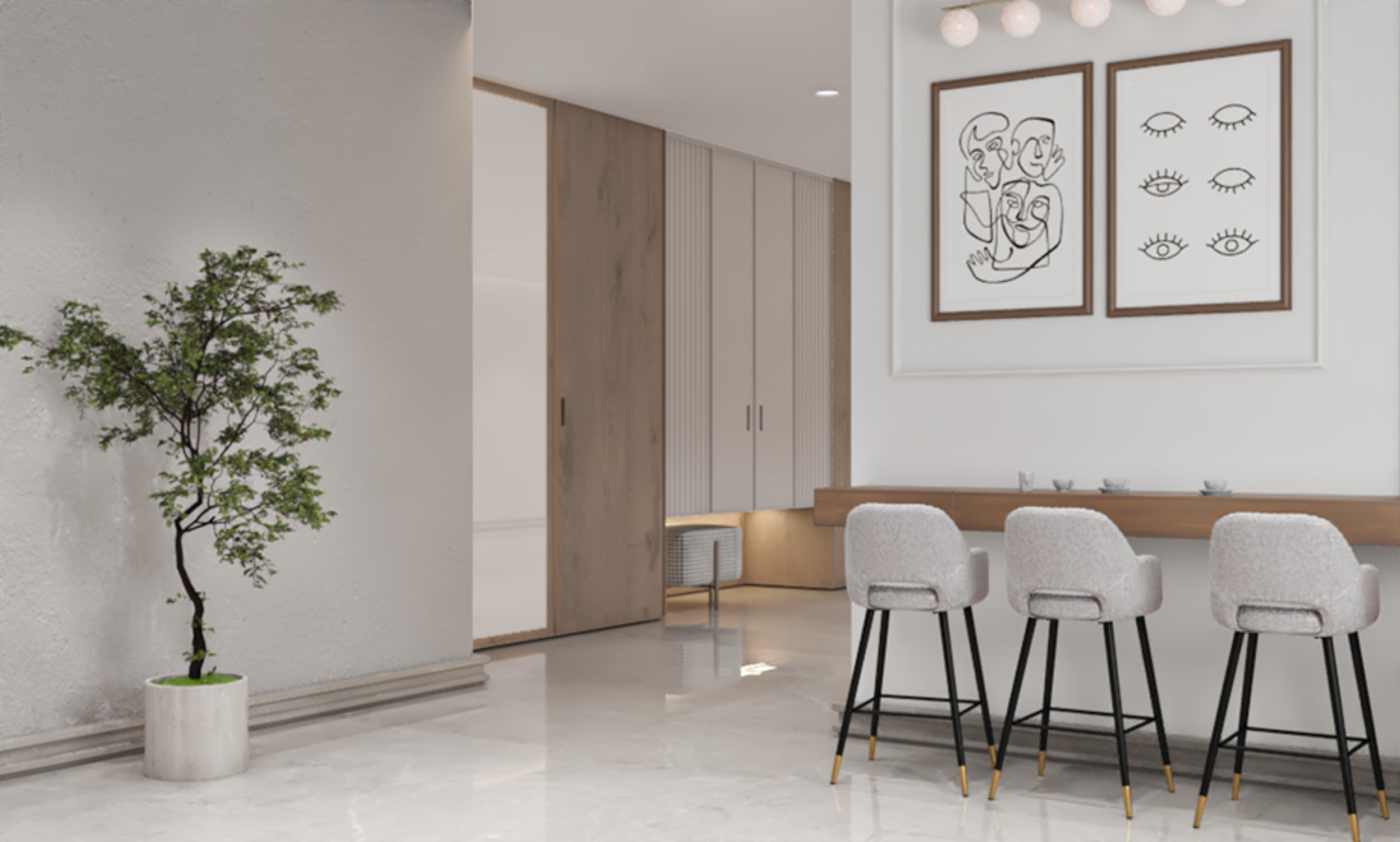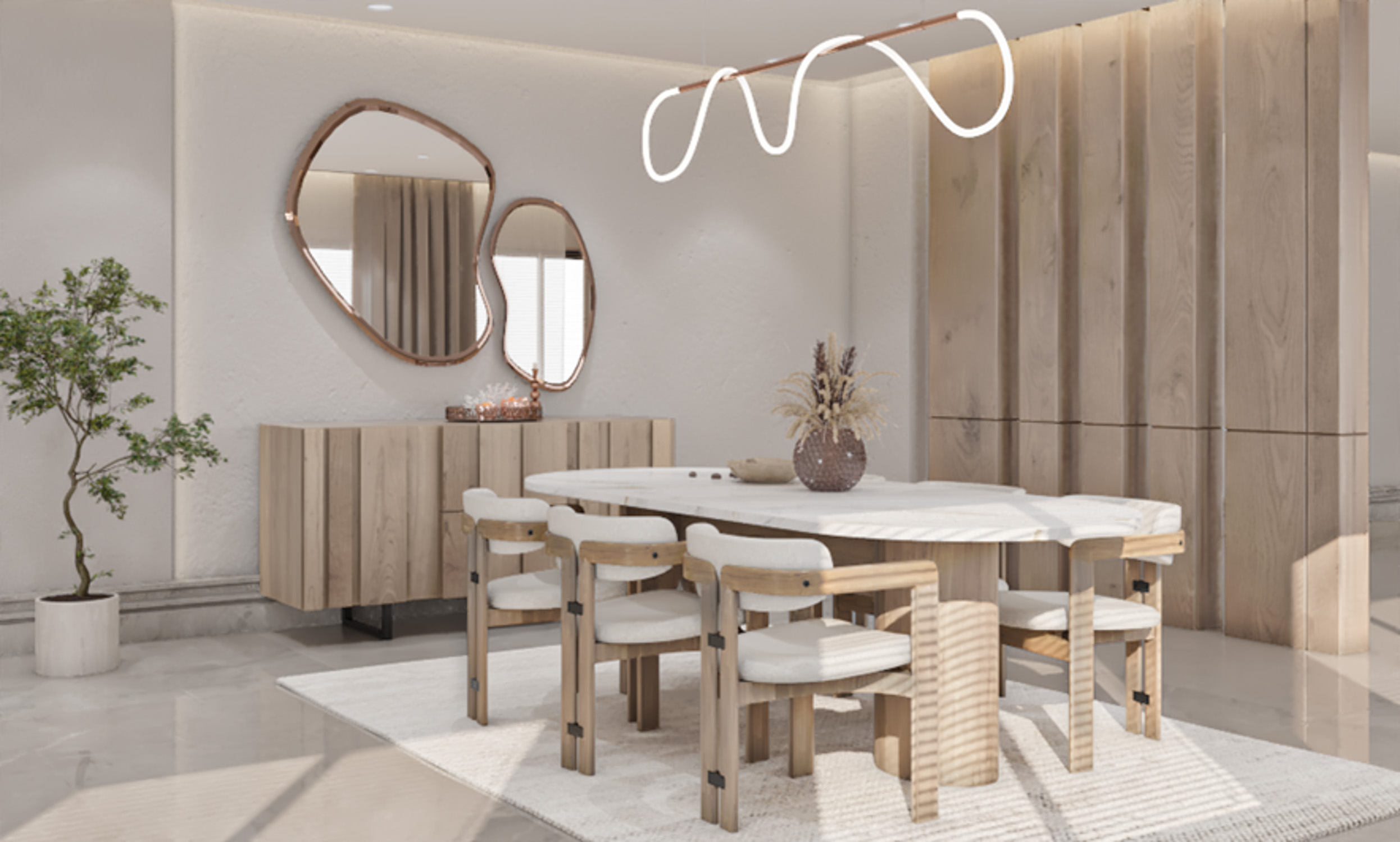 In the basement, we adopted an “organic modern” style, with a children’s play area featuring colorful illustrations and plants for a relaxing ambiance. The seating area used curved furniture and light wood, while the dining area was divided with wooden partitions. Bathrooms featured white marble, bronze sinks, and custom abaya closets. The children’s area had vibrant furniture and tailored bathrooms, while the driver’s room was furnished simply with practical elements.