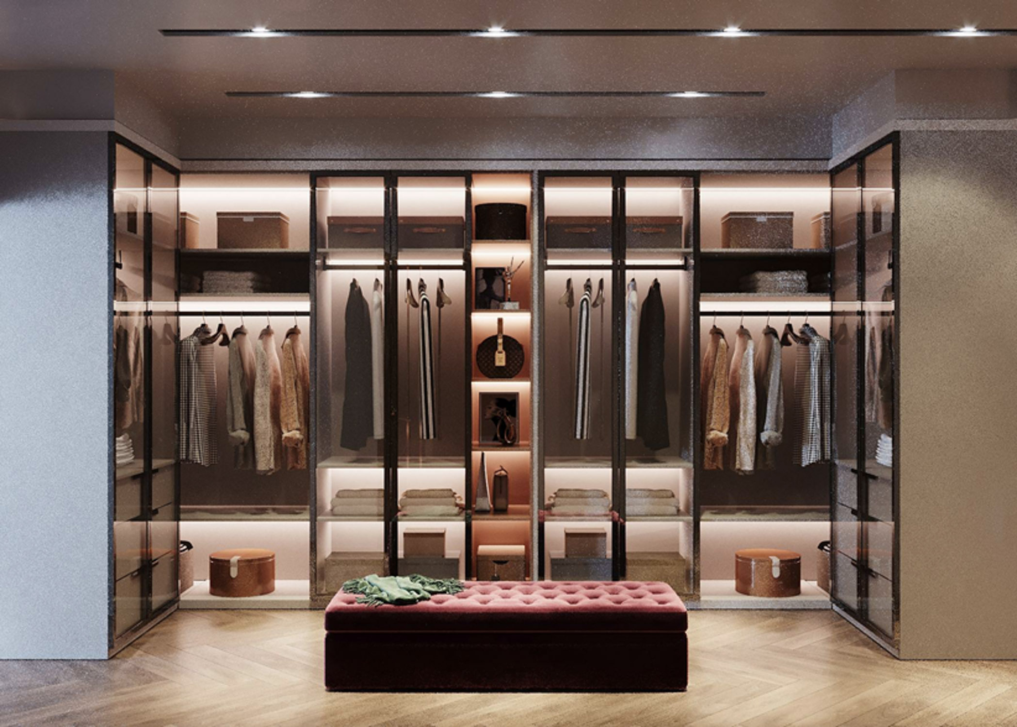 Outdoor spaces included curved furniture, wood accents, a central fireplace, a coffee station, and a main kitchen with light tones and glass shelving. The first floor followed a “neo-classical” style with metal, glass, paneling, wooden cladding, and concealed lighting.