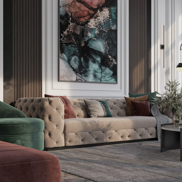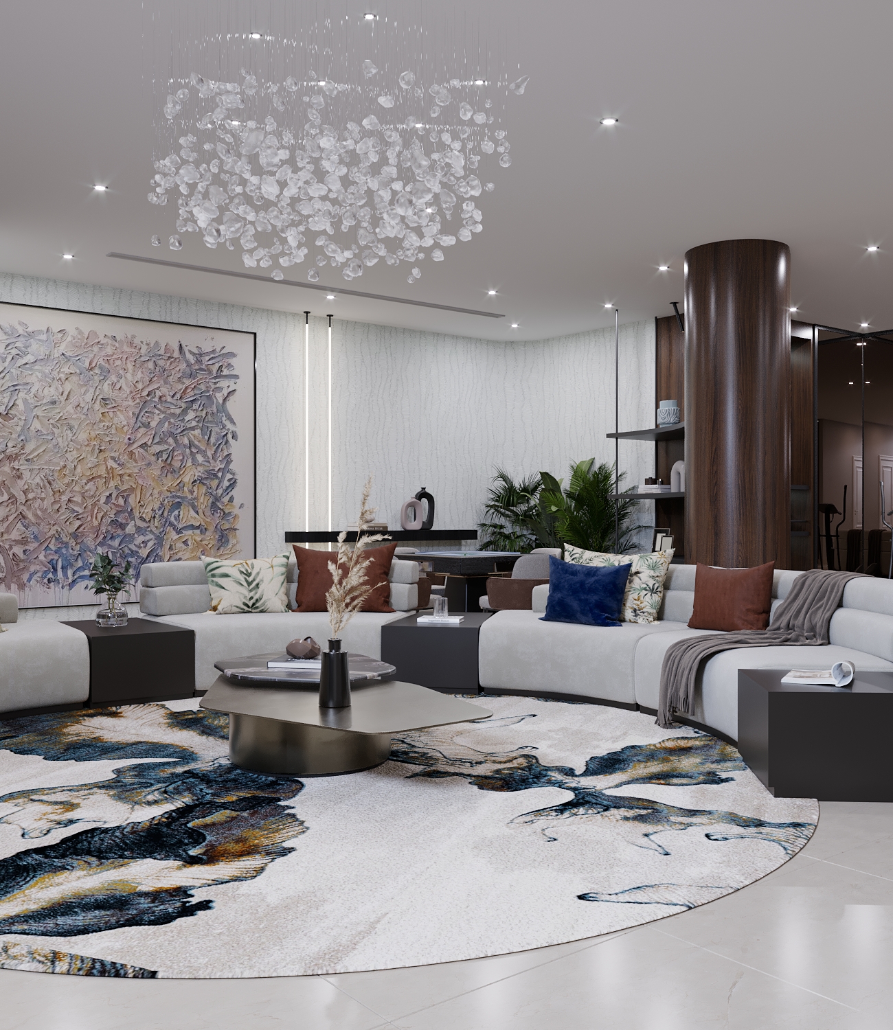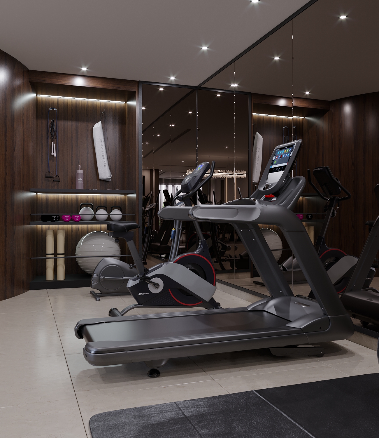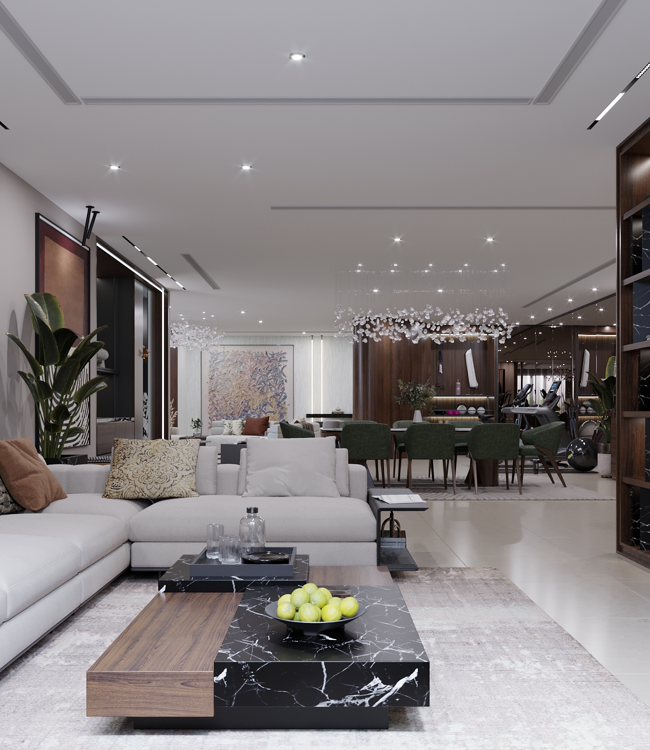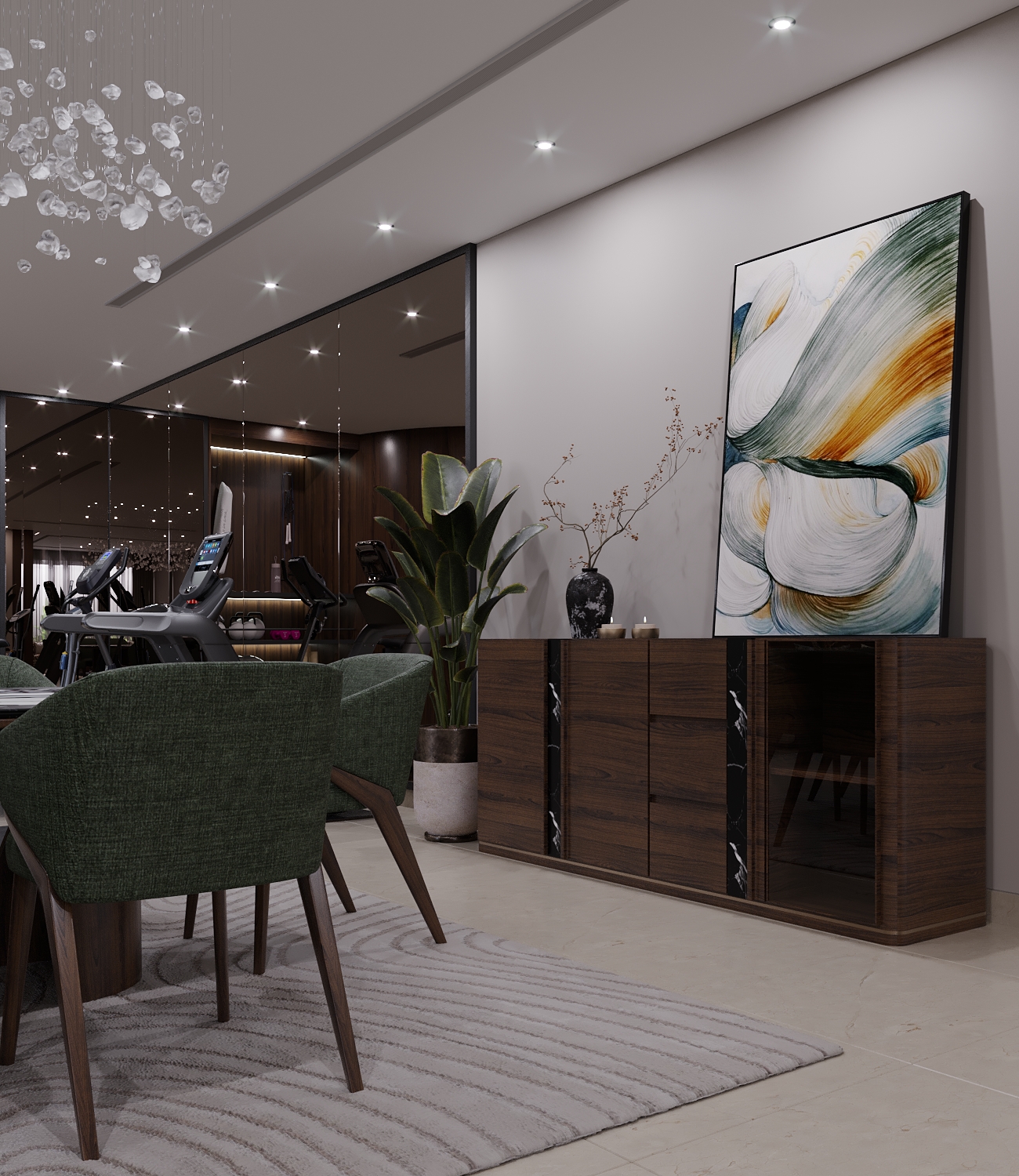 We received this project for designing the basement of a villa with the request of not adding any new walls or separations to include a gym, 2 setting areas and a dining room.