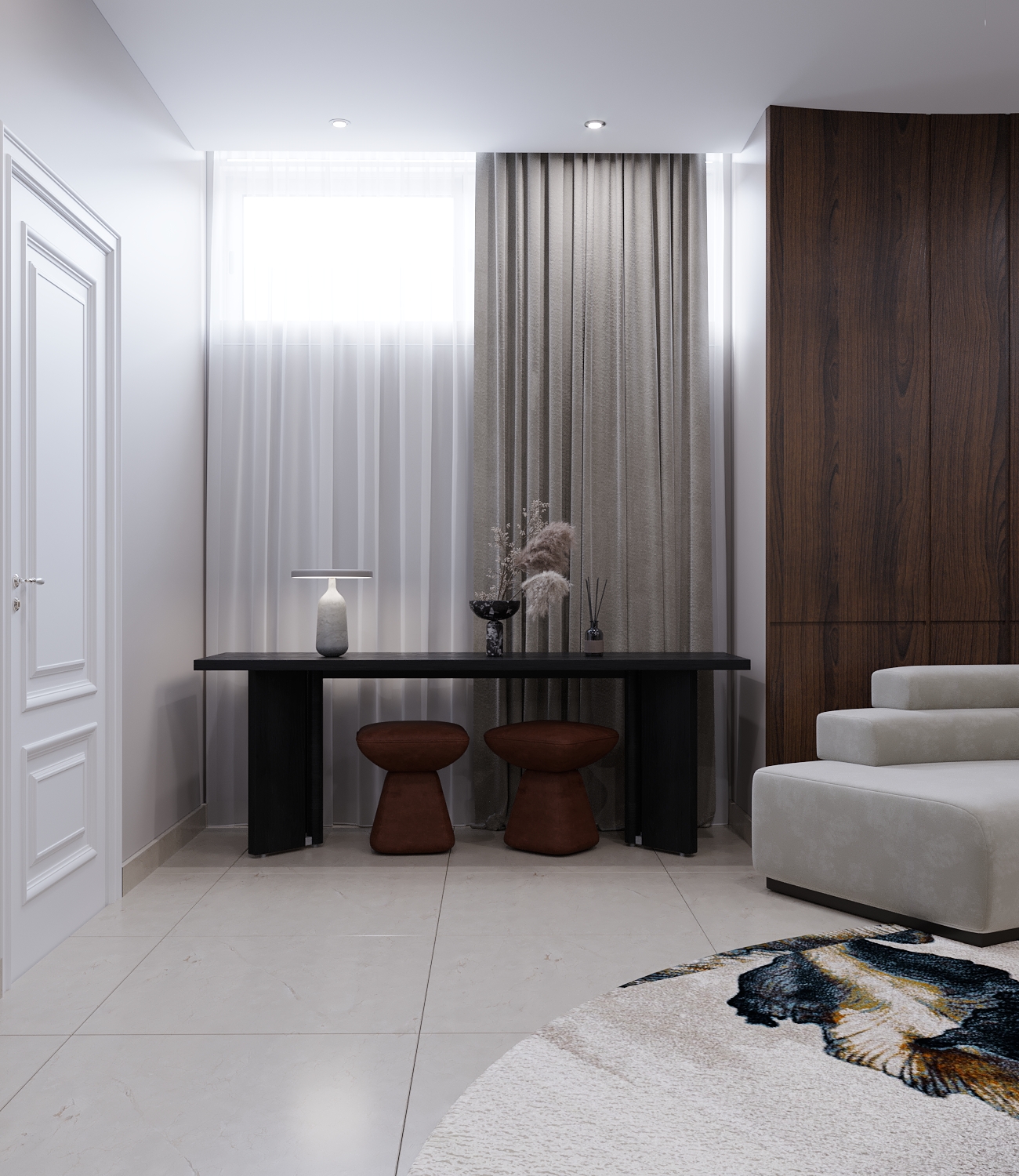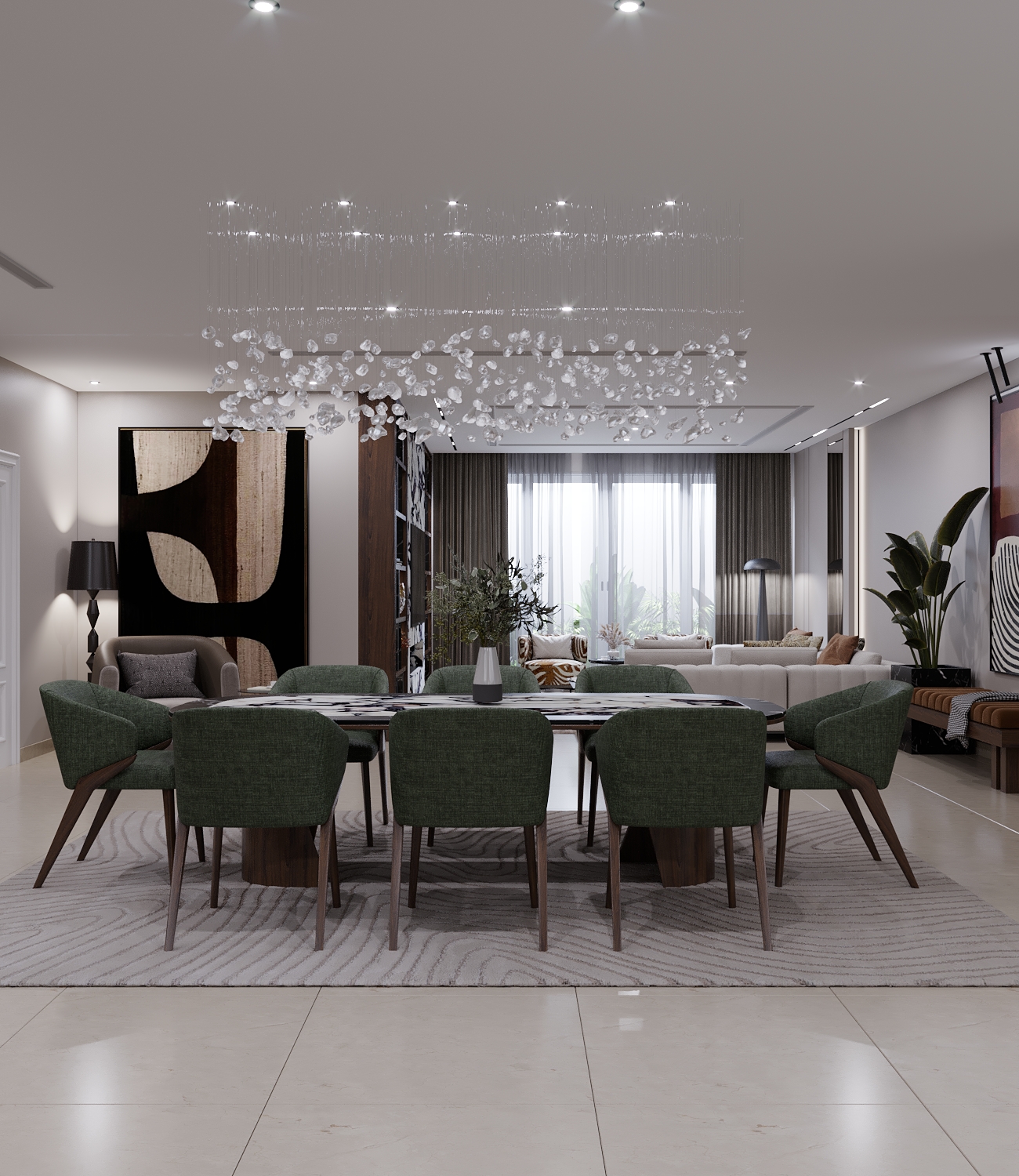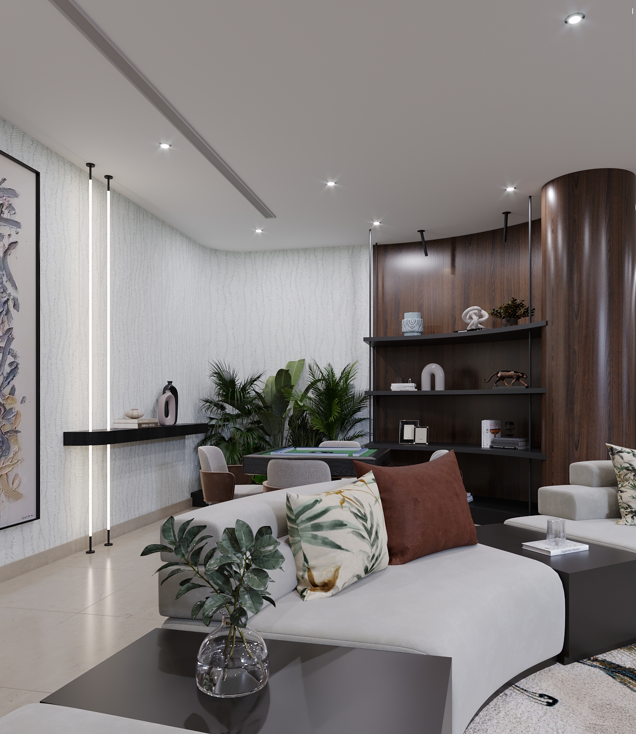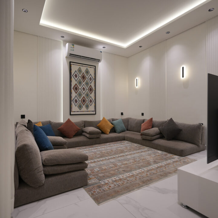 the dining room and kitchenette combination was used as a separation between dad’s setting area and the girls setting area, using wooden accents and simple cladding with a large artwork as a pleasant dazzle. The girls setting area included a large mesmerising wooden library centered with a t.v unit and a fireplace, finally a cozy and warm reading corner with large artwork and a statement lighting piece.