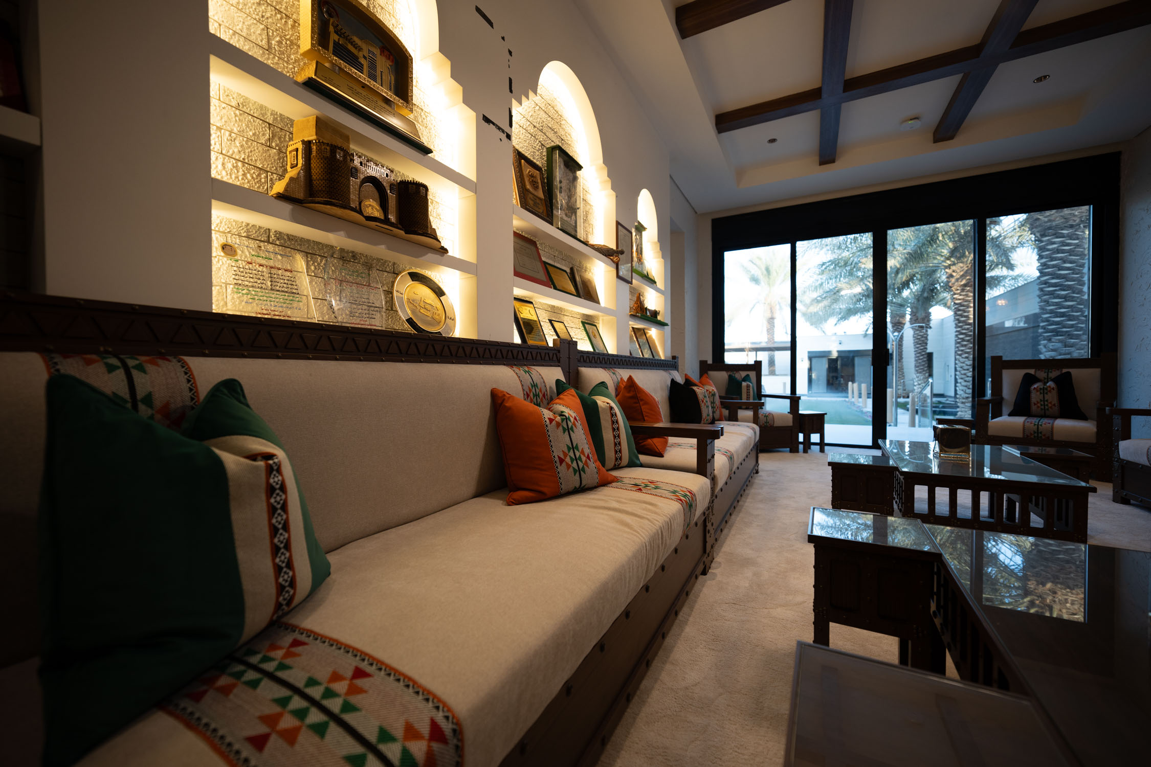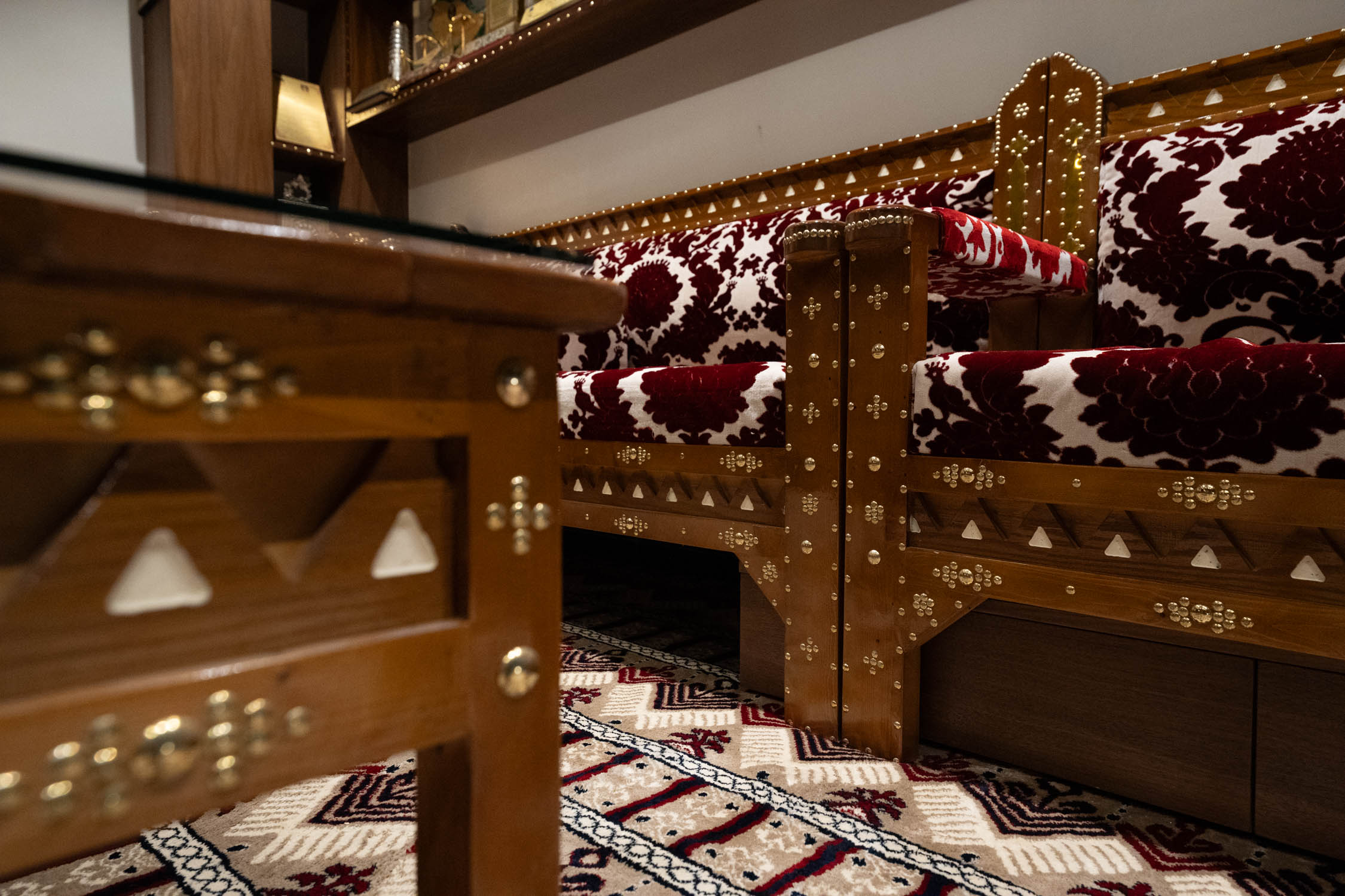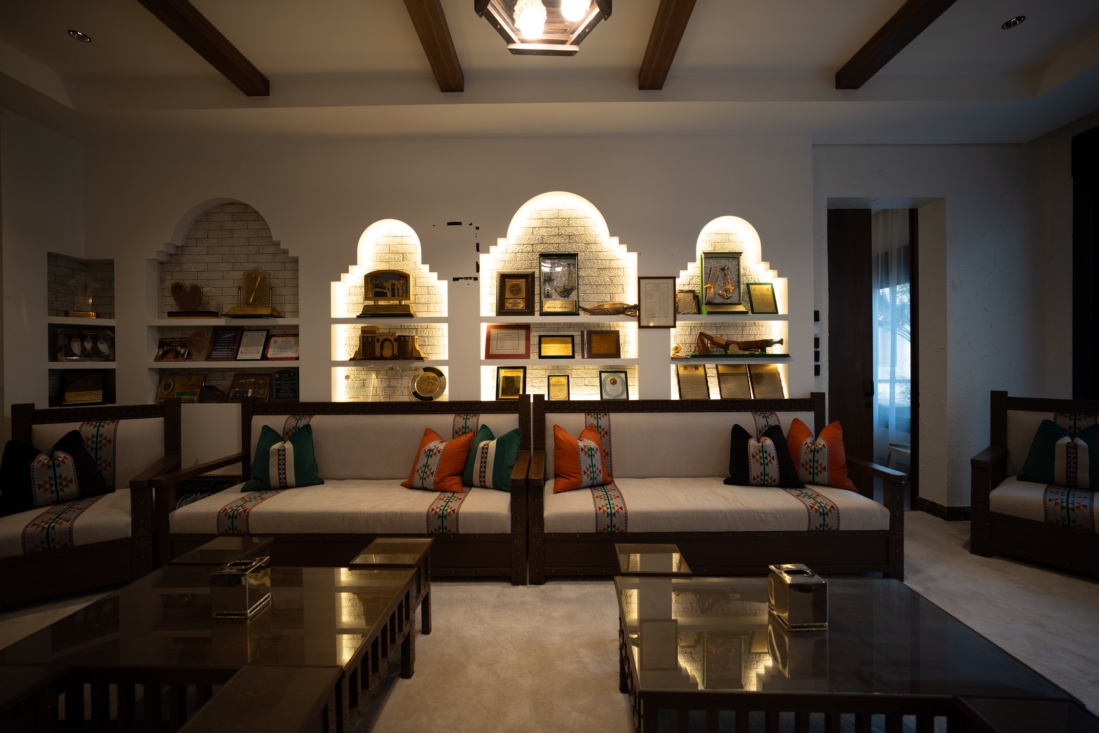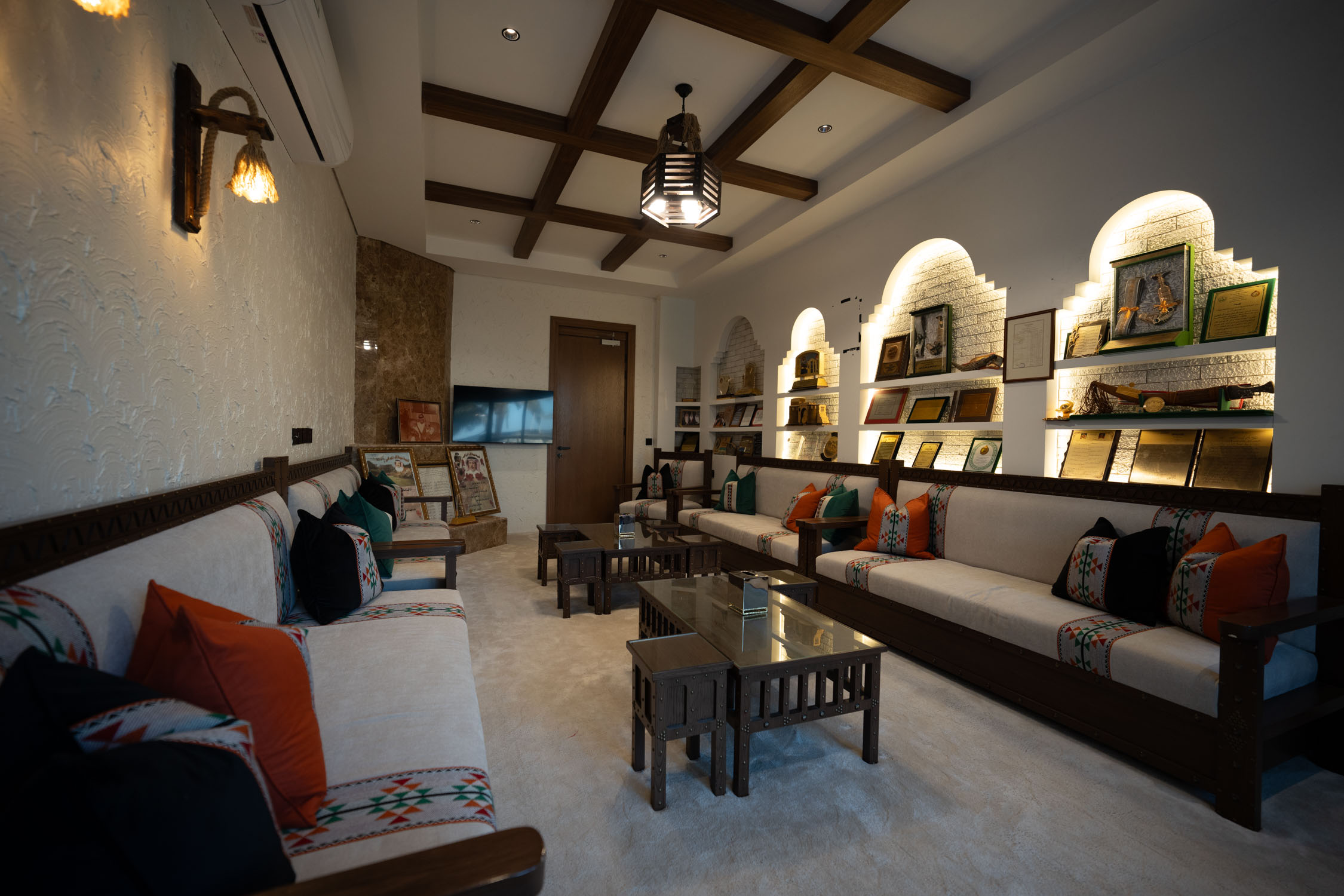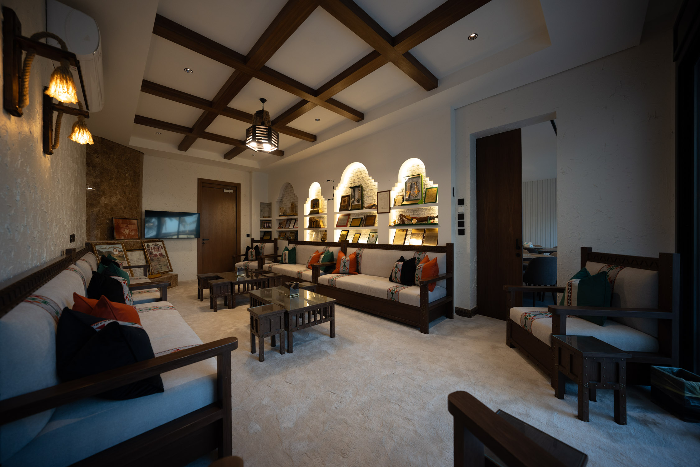 The youth building used wood and leather furniture with a Najdi style. It featured artwork, aramid colored accessories, and weapons on the walls. The dinner area had bright colors and simple wall designs. The second bedroom was simple with a plant element in the TV unit. The kitchen was white with black marble and wood. There was also a simple bedroom with a bathroom.