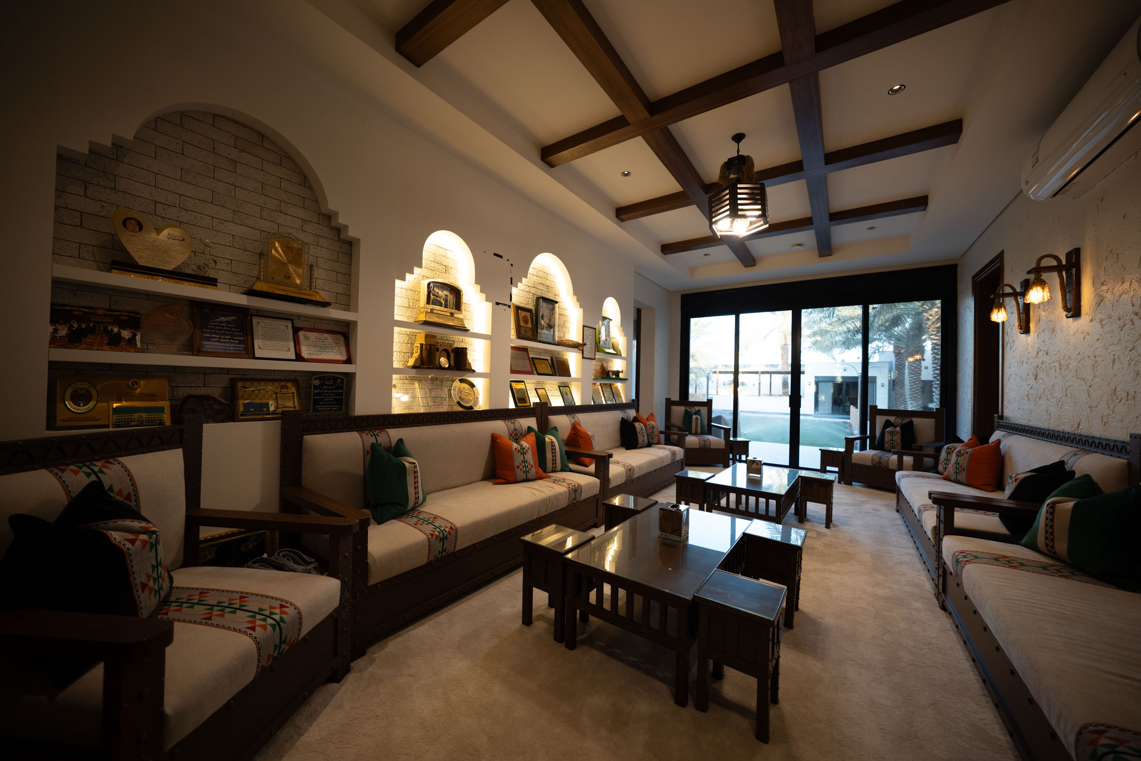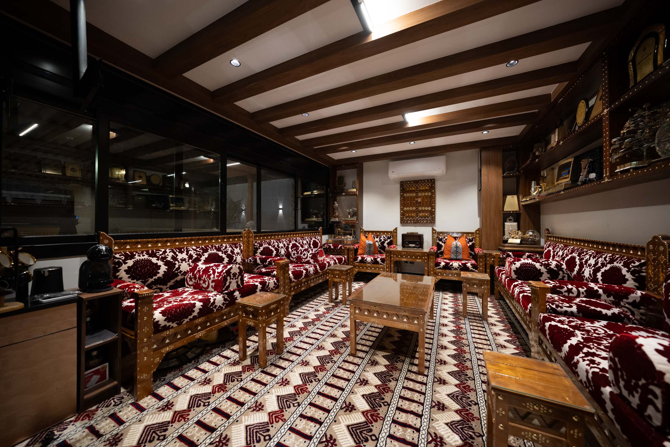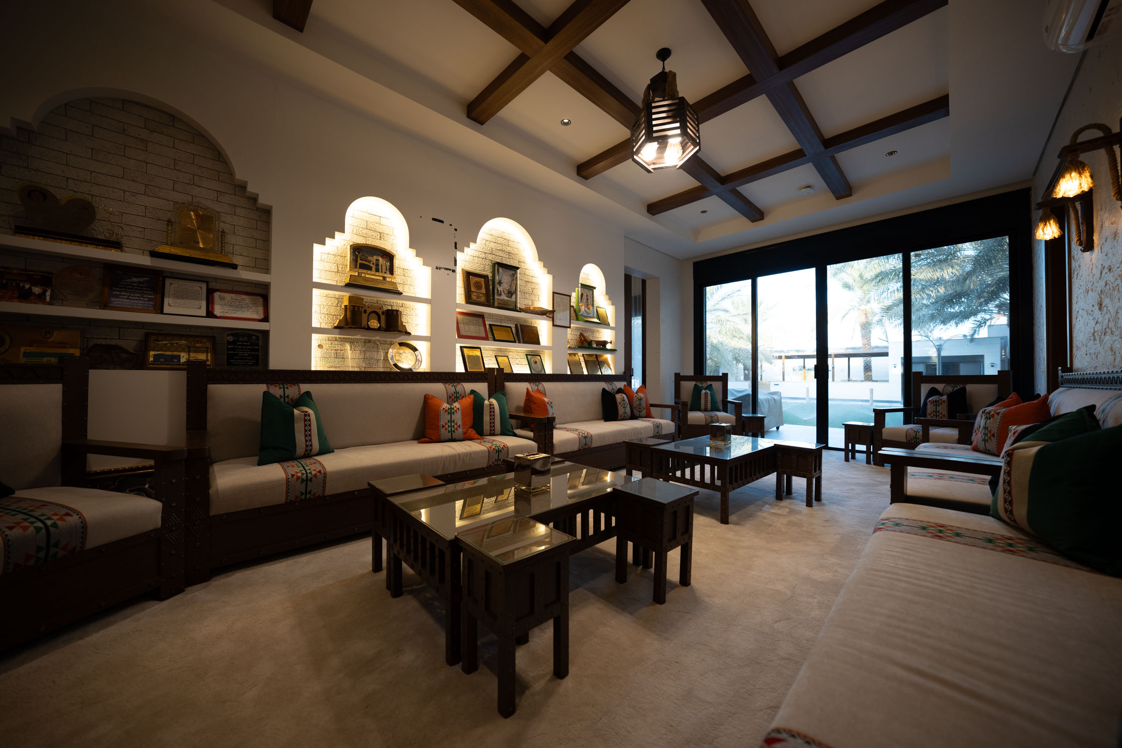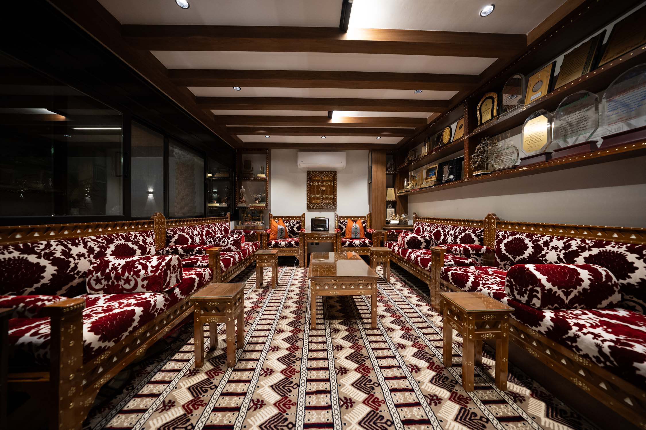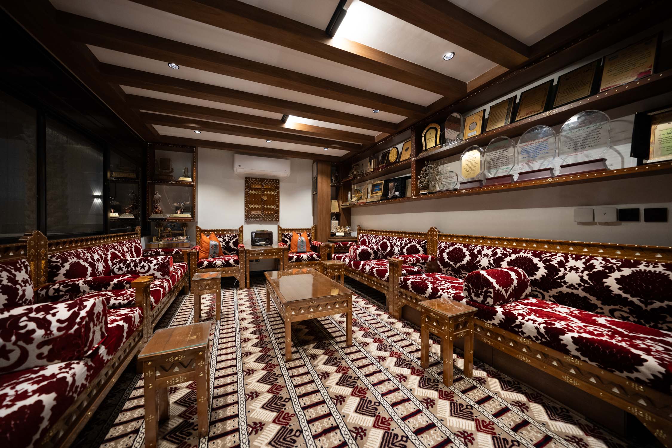 The youth building used wood and leather furniture with a Najdi style. It featured artwork, aramid colored accessories, and weapons on the walls. The dinner area had bright colors and simple wall designs. The second bedroom was simple with a plant element in the TV unit. The kitchen was white with black marble and wood. There was also a simple bedroom with a bathroom.