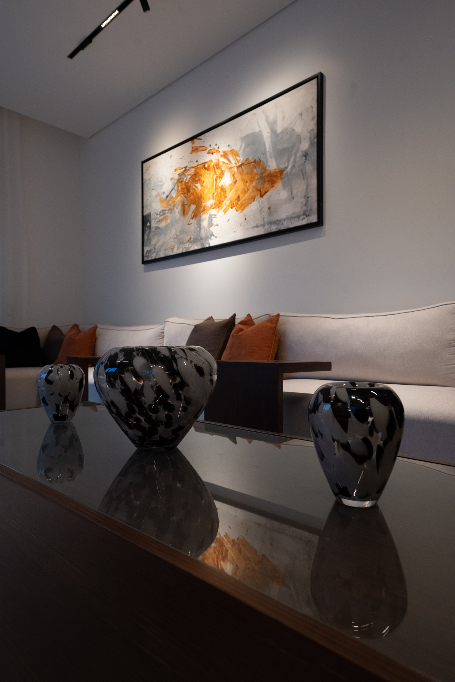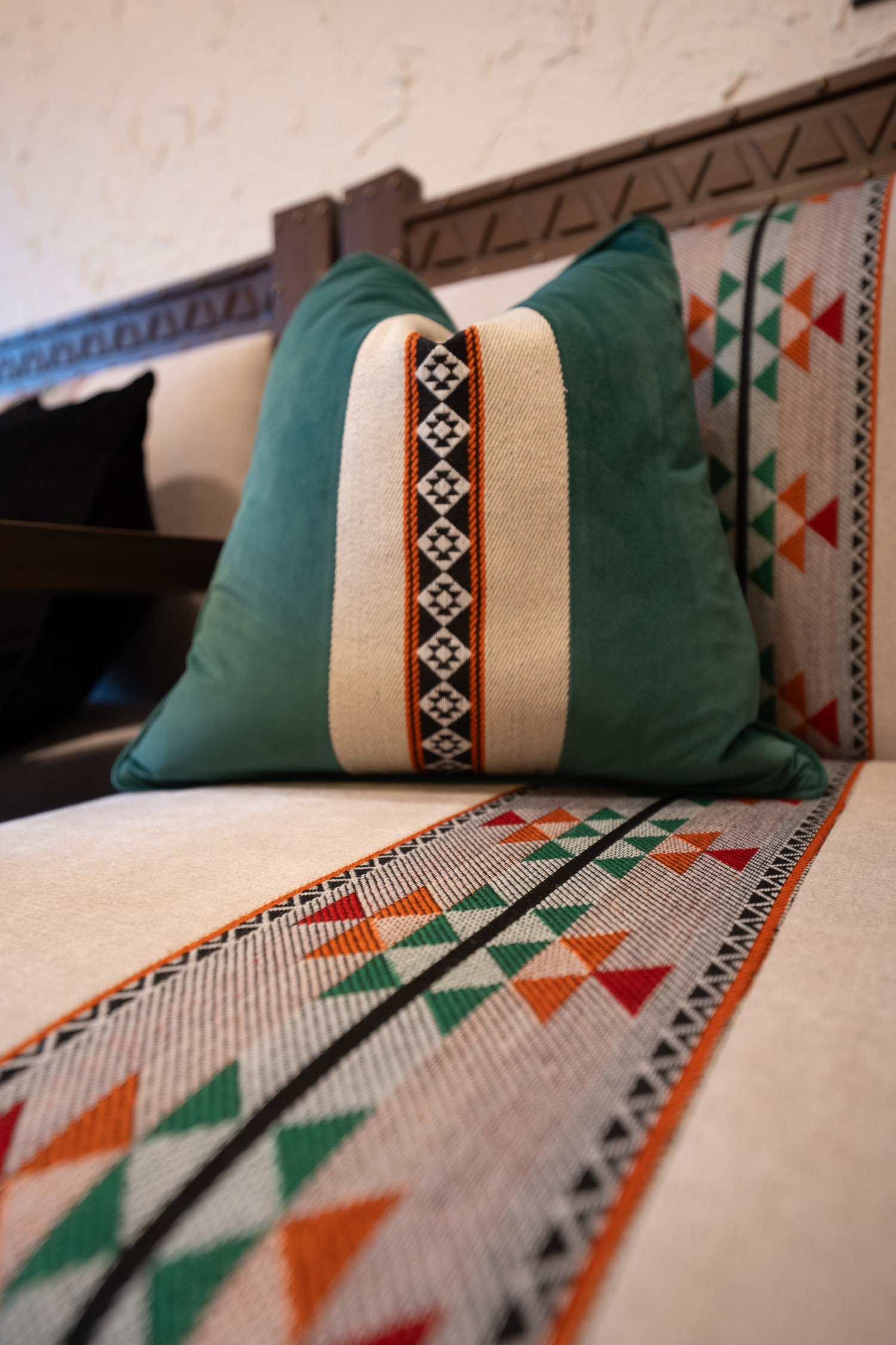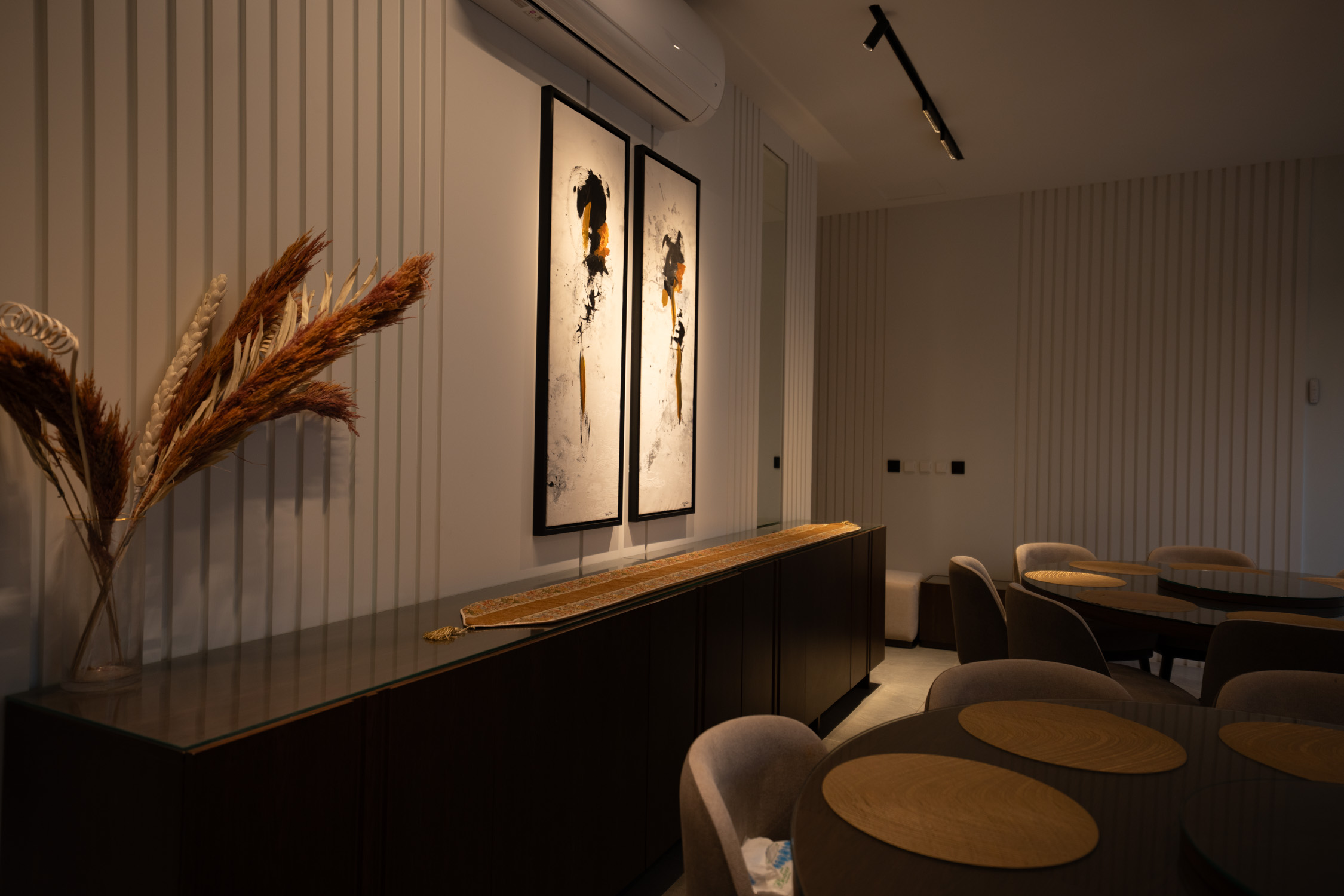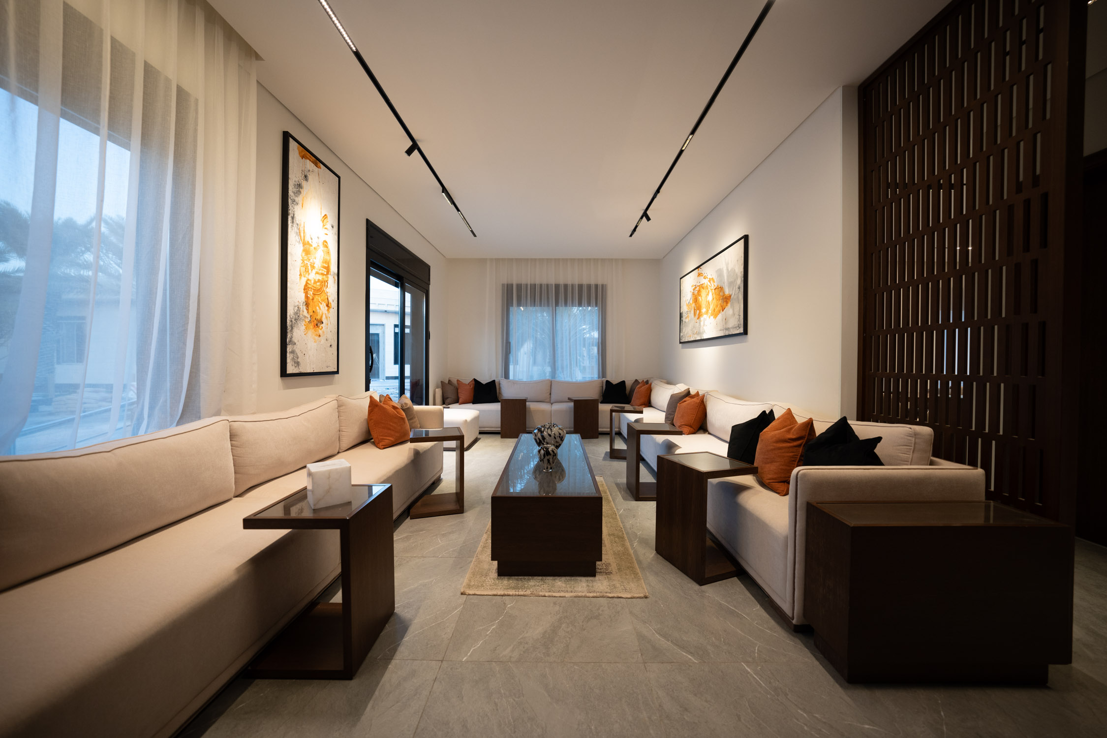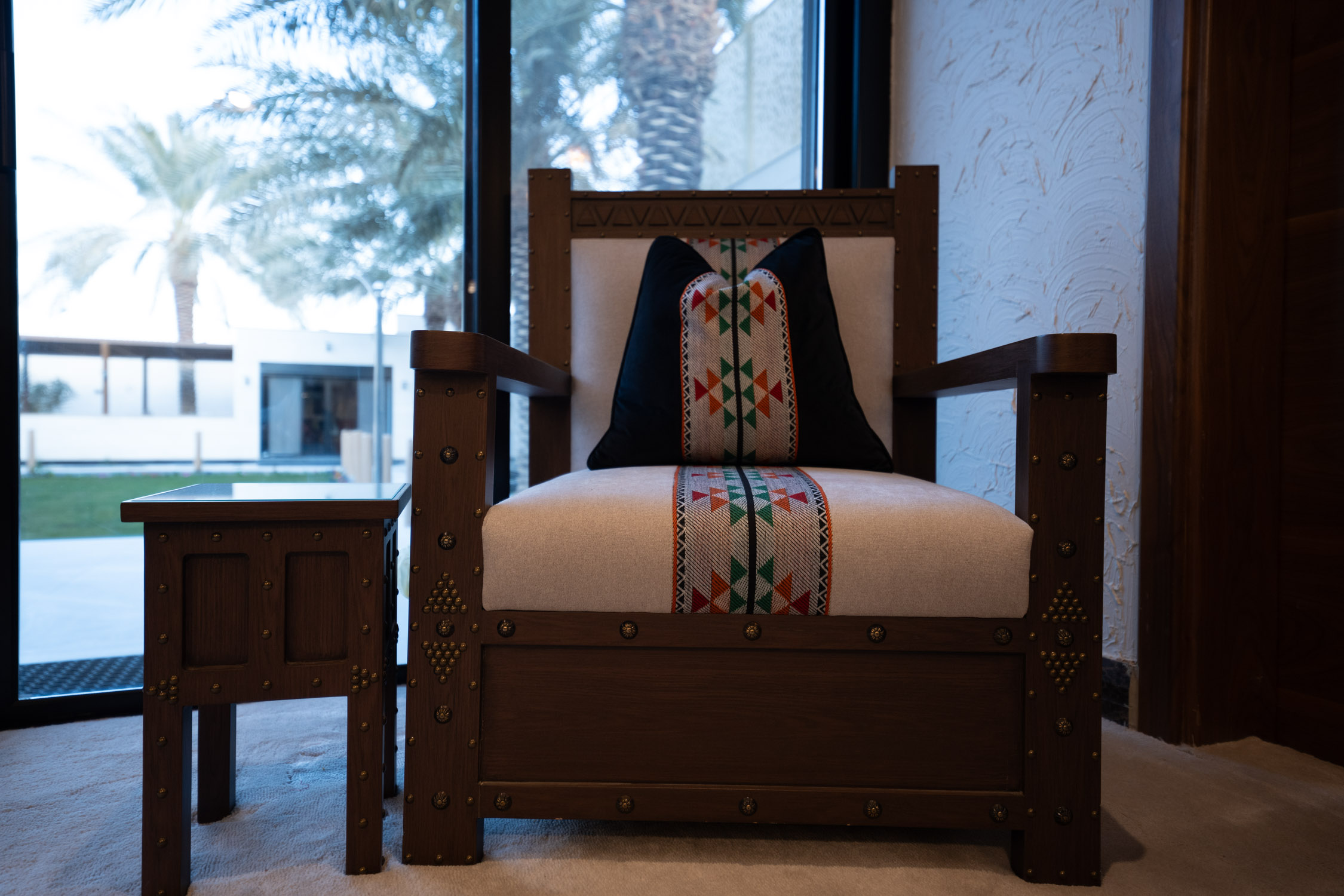 The youth building used wood and leather furniture with a Najdi style. It featured artwork, aramid colored accessories, and weapons on the walls. The dinner area had bright colors and simple wall designs. The second bedroom was simple with a plant element in the TV unit. The kitchen was white with black marble and wood. There was also a simple bedroom with a bathroom.