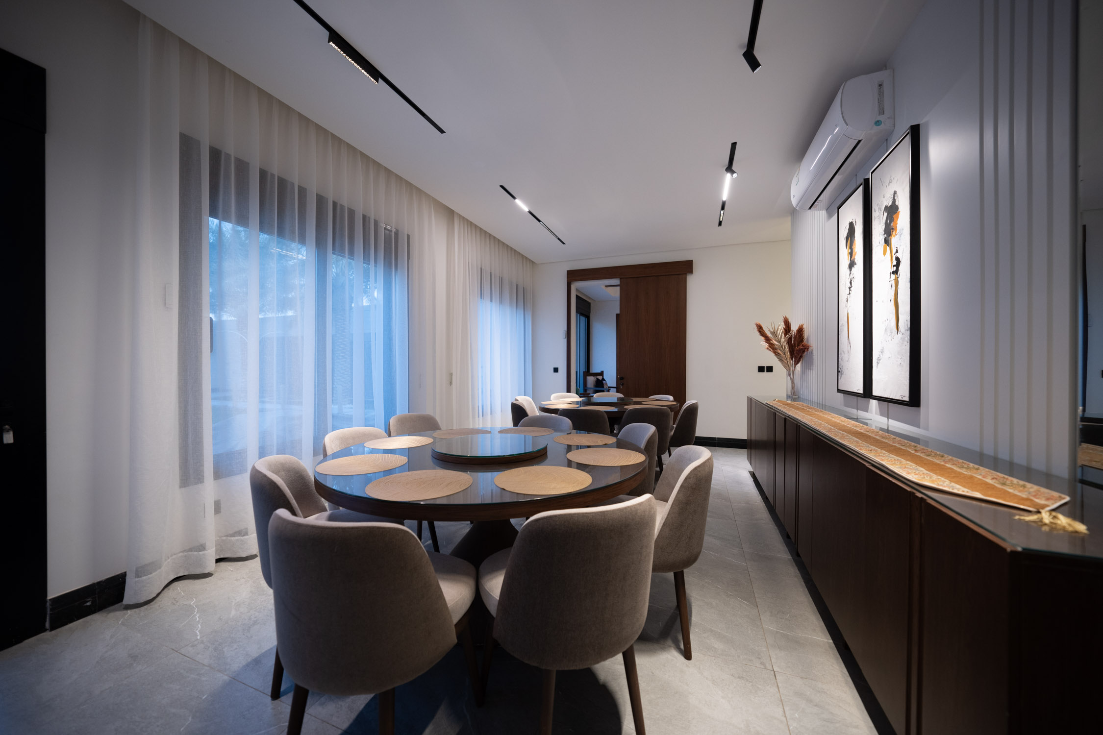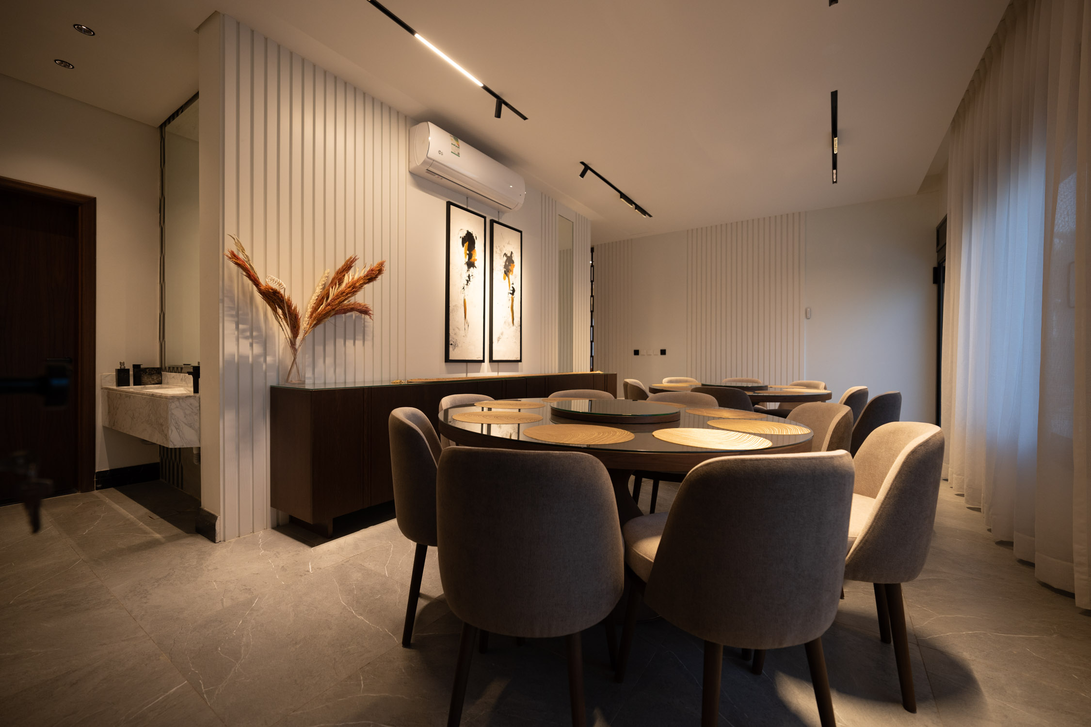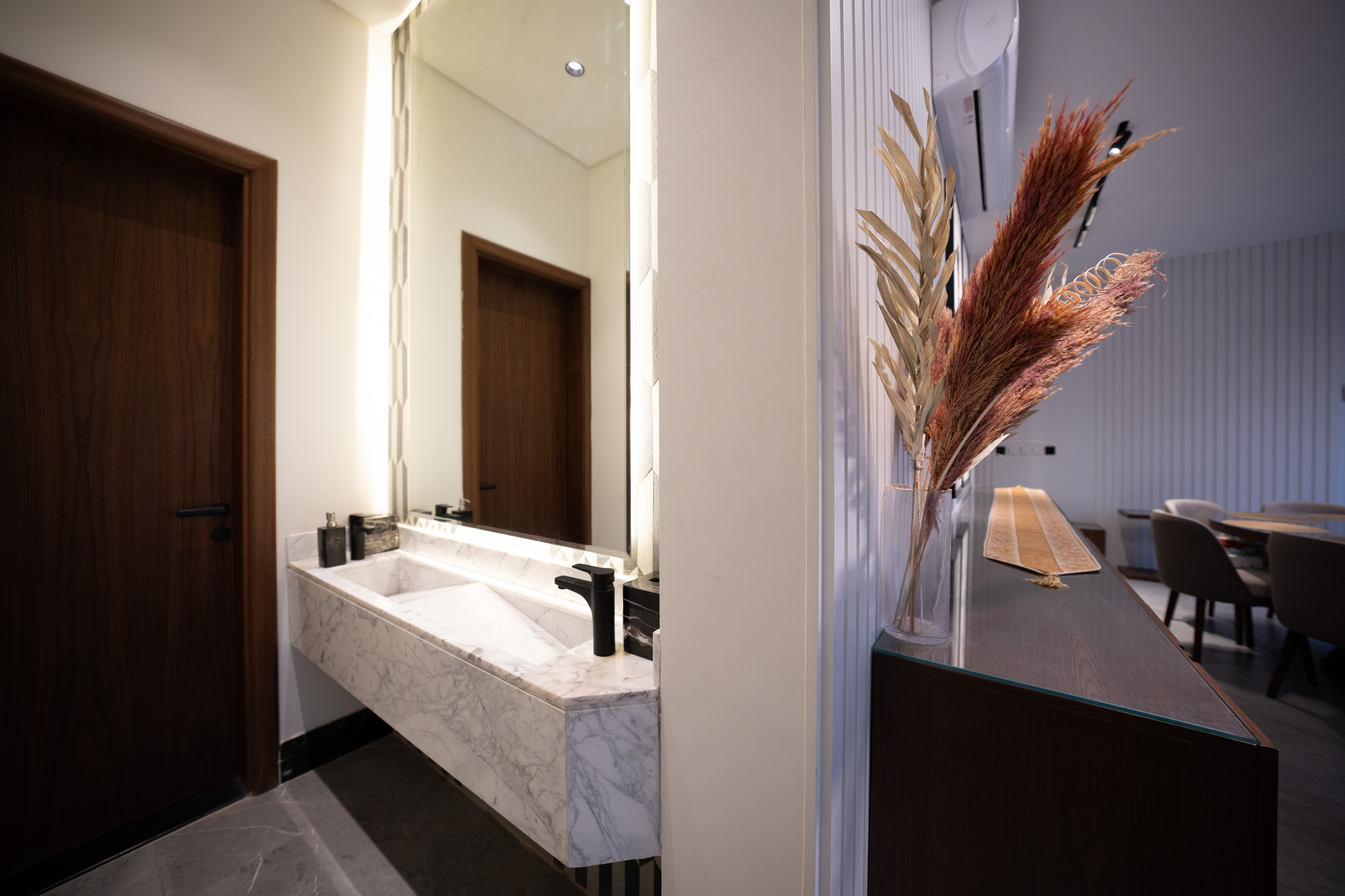 The main building used a neoclassical design style for a luxurious feel. It featured marble floors, neoclassical marble wall and column panels, black and gold tables, and luxurious curtains. The wash area had large mirrors and a huge marble sink. The kitchen was modern with black and white colors with bronze and hidden lights. The dining room was spacious with a marble table, blue chairs, and a large lamp. The second kitchen was also modern with white, wood, and black marble colors. There was a simple bedroom with wooden cladding and a TV unit.
