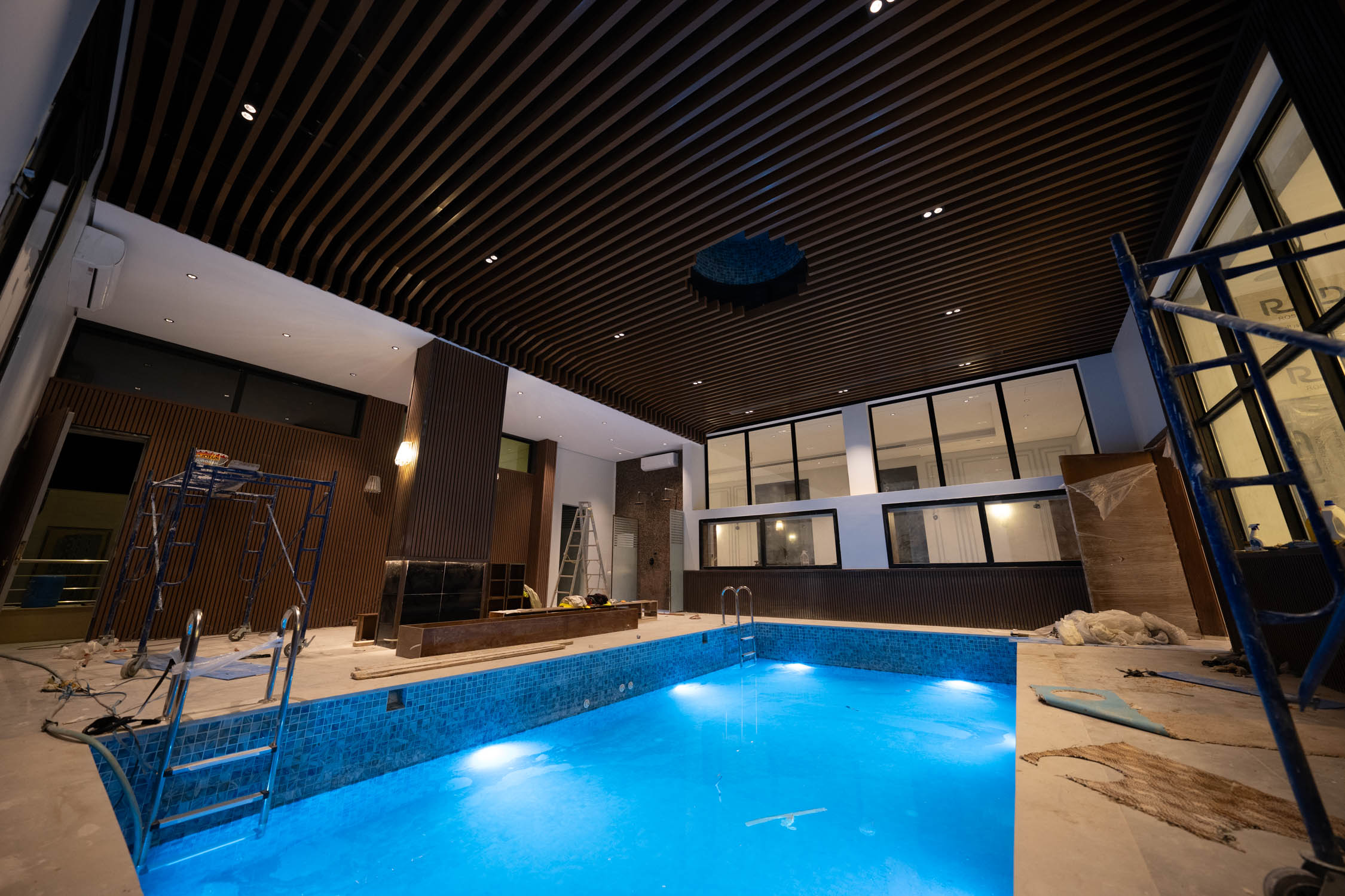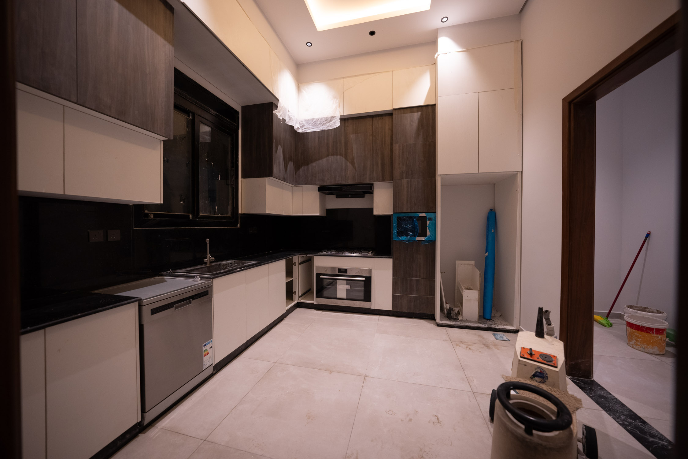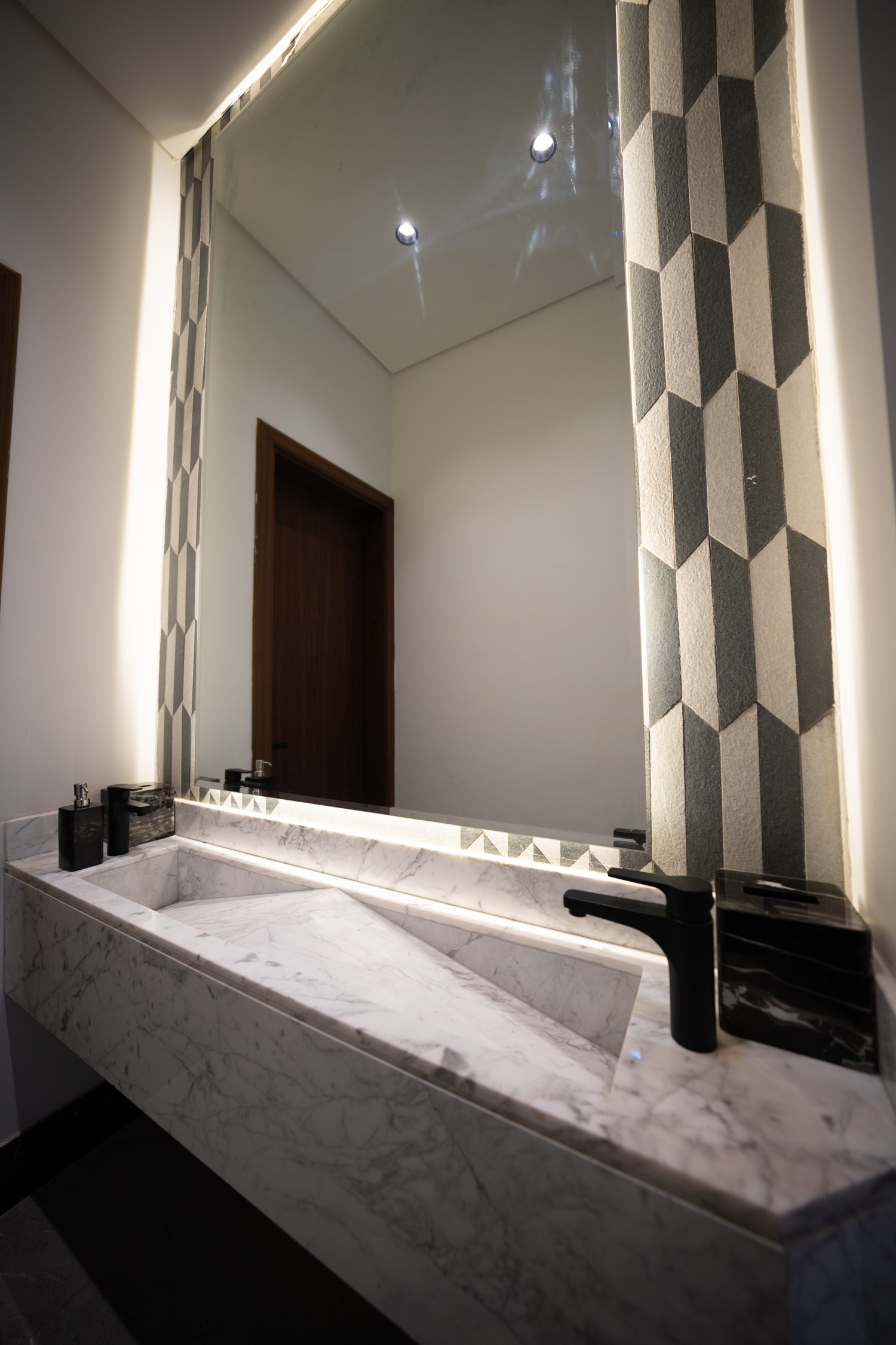 The main building used a neoclassical design style for a luxurious feel. It featured marble floors, neoclassical marble wall and column panels, black and gold tables, and luxurious curtains. The wash area had large mirrors and a huge marble sink. The kitchen was modern with black and white colors with bronze and hidden lights. The dining room was spacious with a marble table, blue chairs, and a large lamp. The second kitchen was also modern with white, wood, and black marble colors. There was a simple bedroom with wooden cladding and a TV unit.