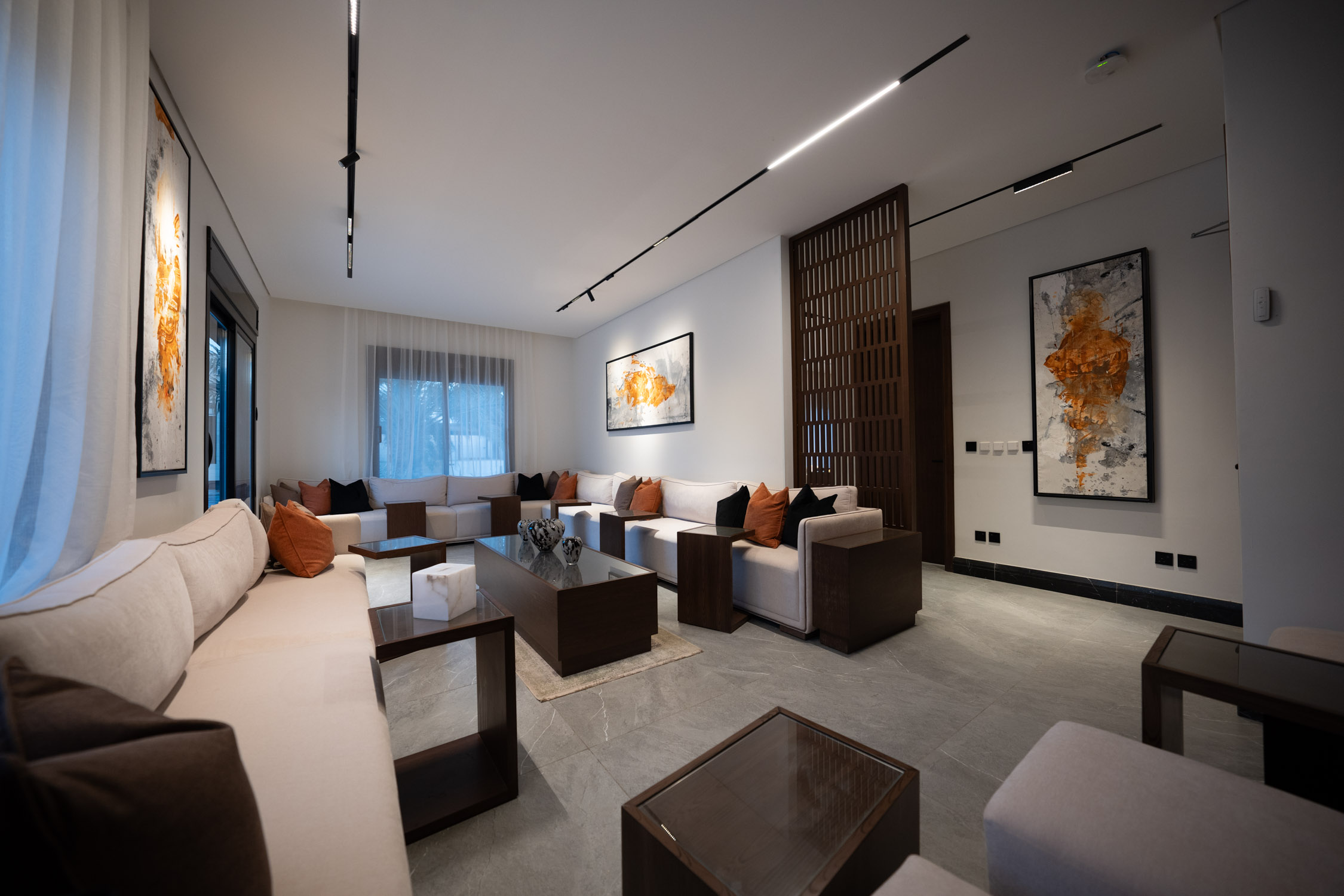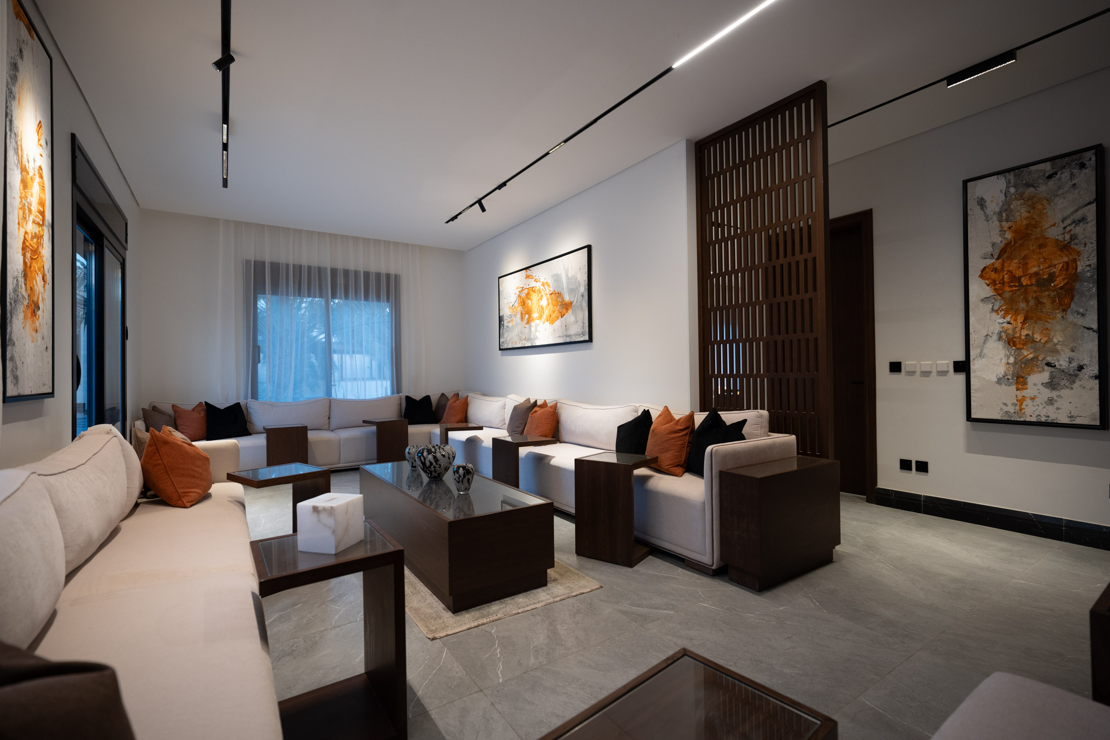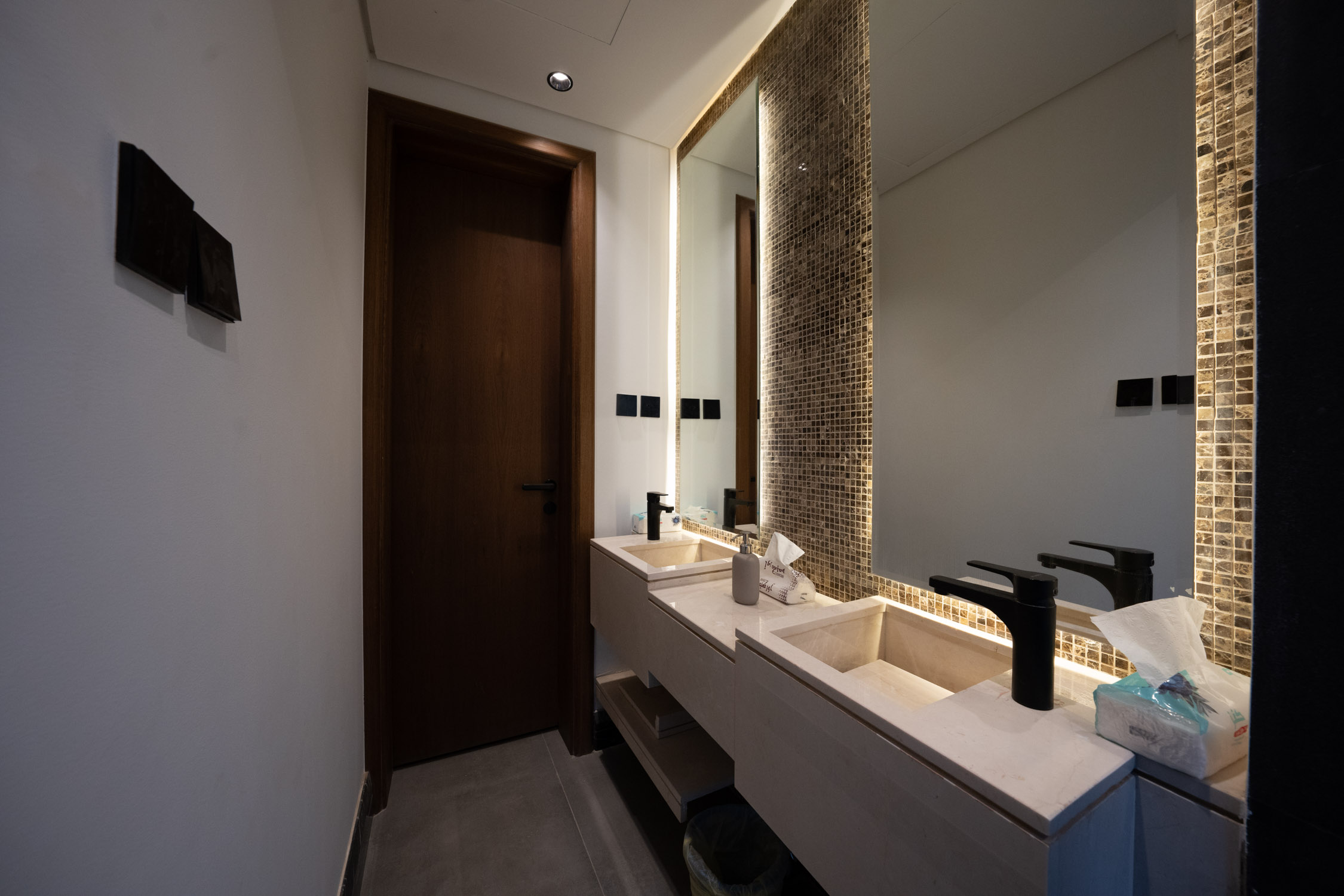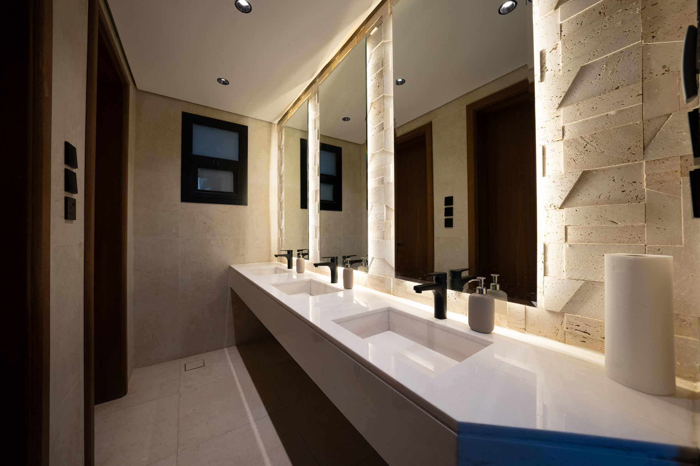 The family building used a modern style. It featured a large dining room with a sofa, a marble TV unit, and an Arabic sitting area. The bathroom had a marble sink and black framed mirror. The rooms were generally modern and simple with light colors and white and wood furniture. There was a small prayer hall with Islamic decorations and dark colored marble.