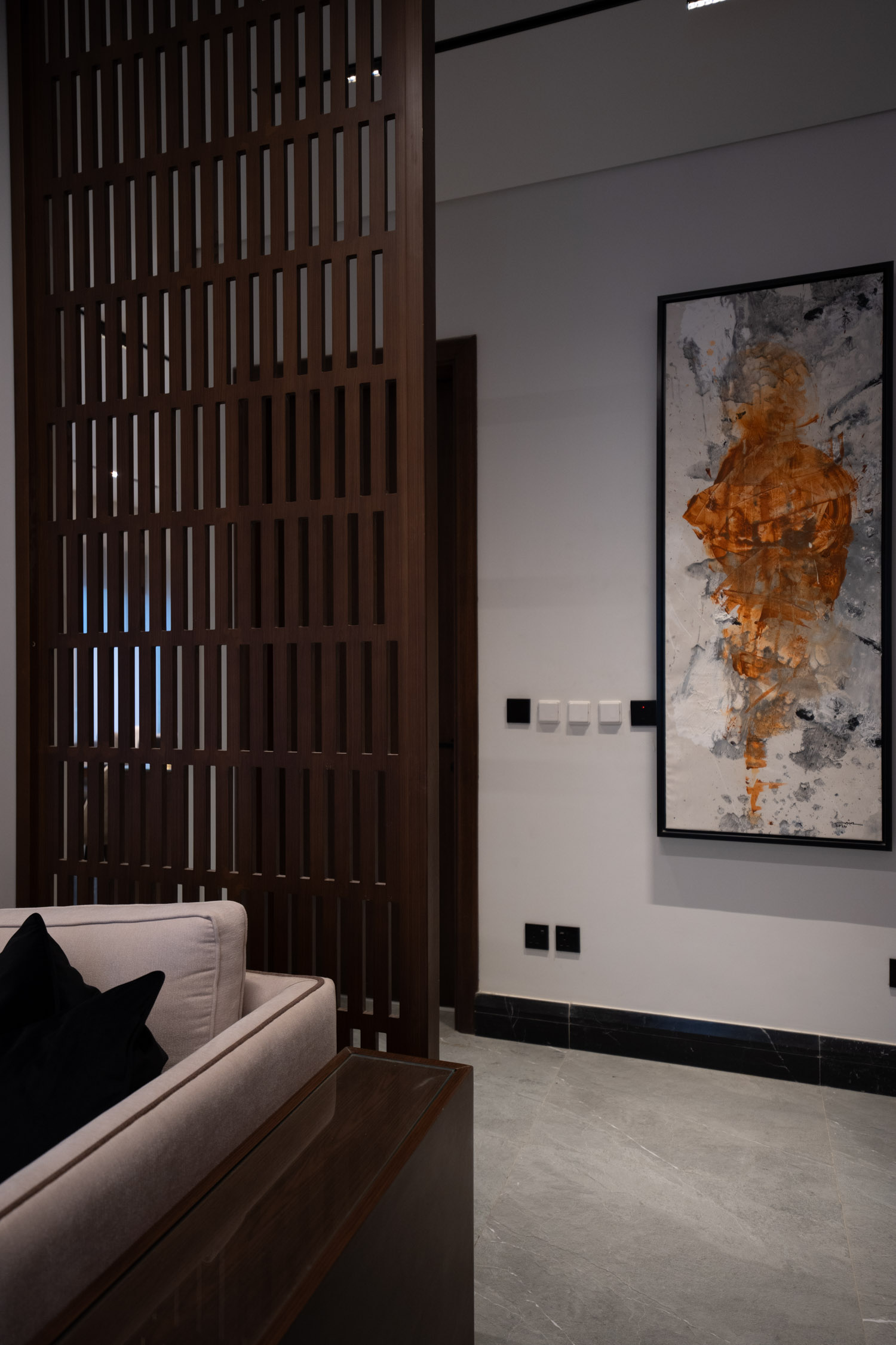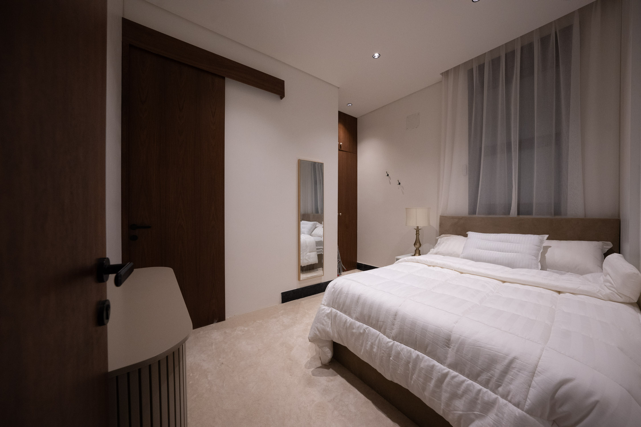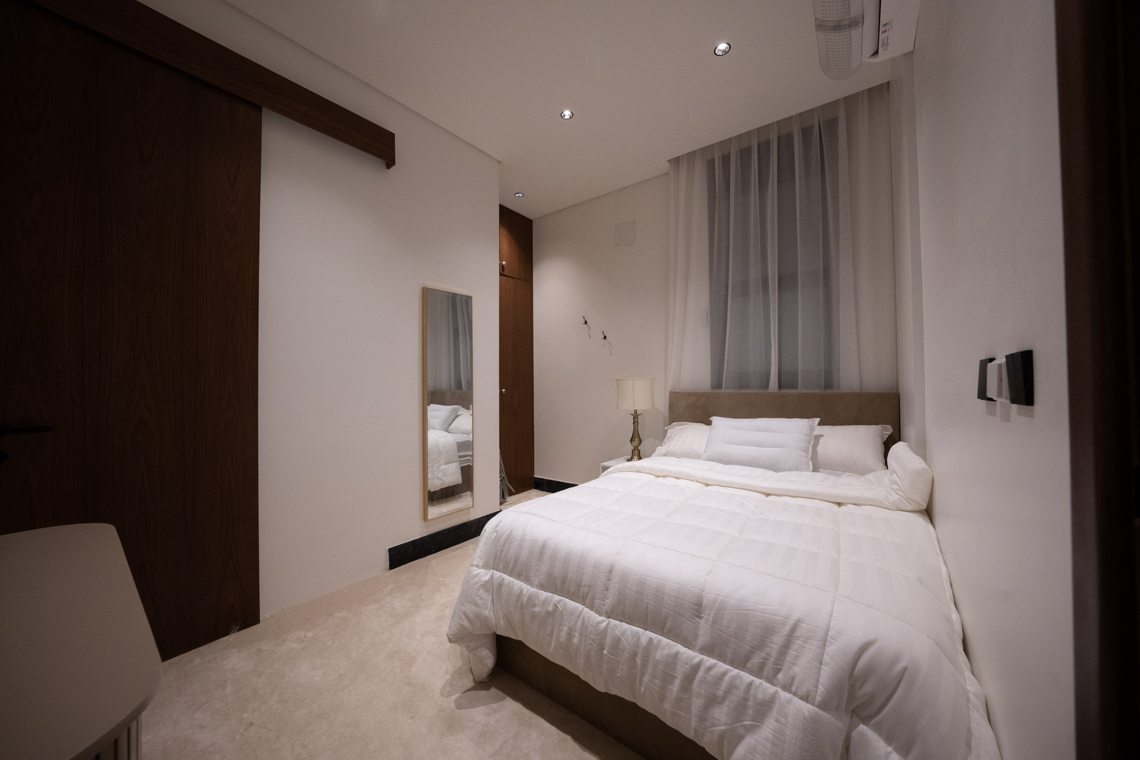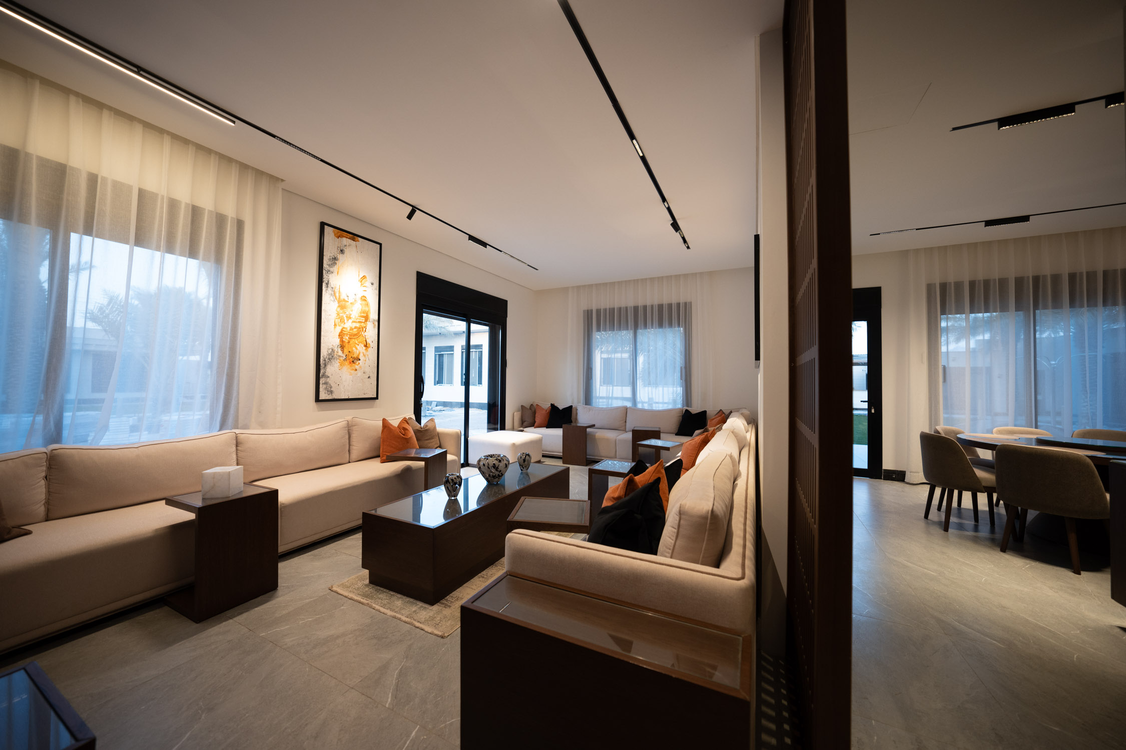 The family building used a modern style. It featured a large dining room with a sofa, a marble TV unit, and an Arabic sitting area. The bathroom had a marble sink and black framed mirror. The rooms were generally modern and simple with light colors and white and wood furniture. There was a small prayer hall with Islamic decorations and dark colored marble.