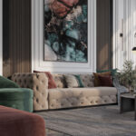 The majlis area showcases a compelling interplay of beige and grey tones. To fit the needs of the family, we expanded the bathrooms and included dual sinks. In the girls’ bedroom, we prioritized privacy by providing separate beds and storage shelves for each daughter, while also creating a tailored playroom for studying and entertainment. To optimize space, we added a wooden extension to the staircase for storage and painted it to match the existing color scheme. Finally, on the rooftop, we designed a versatile space that seamlessly combines gym and office functionalities, offering the client the convenience of studying or working out from home. To maintain the organic theme, we selected hexagon tiles for the bathroom toilet.