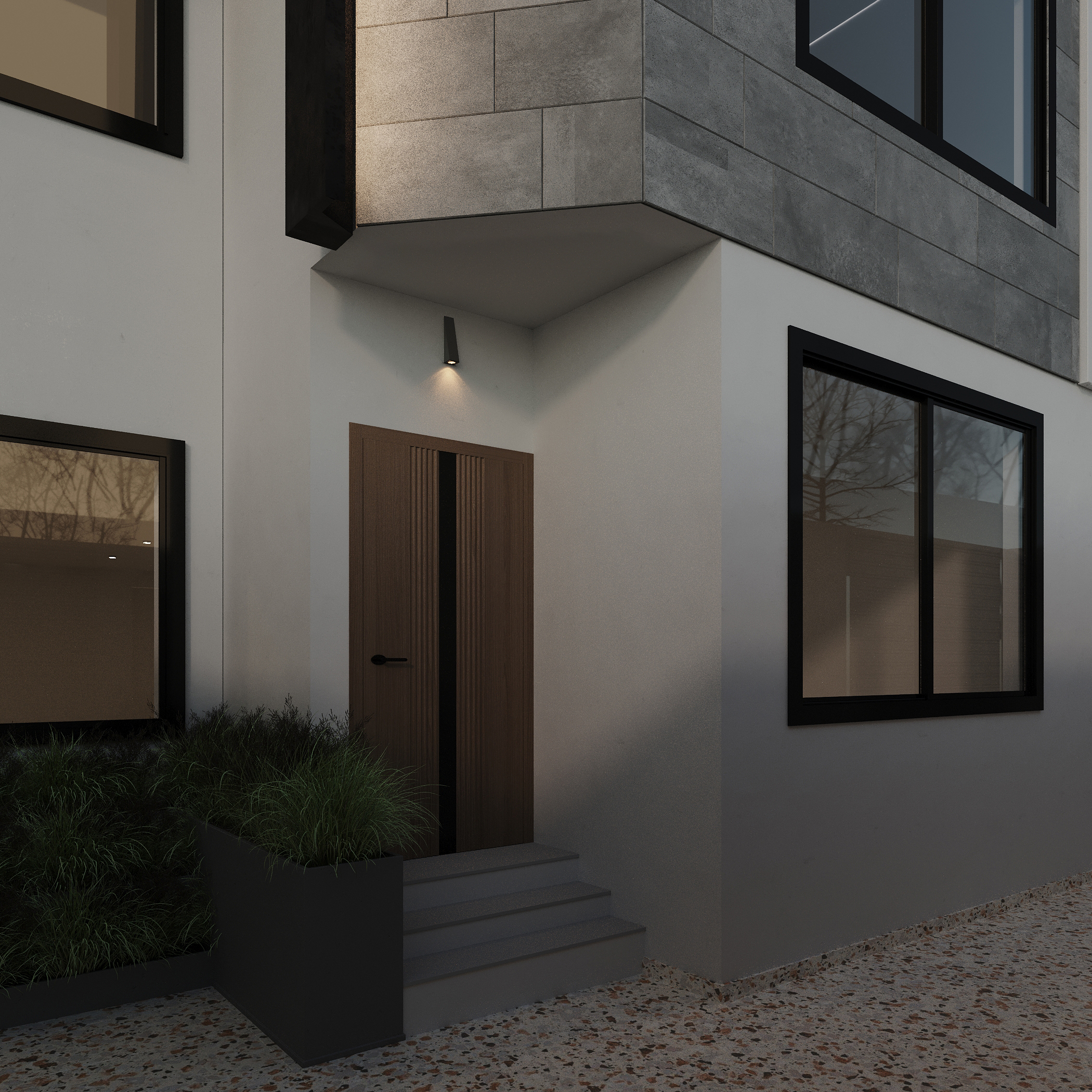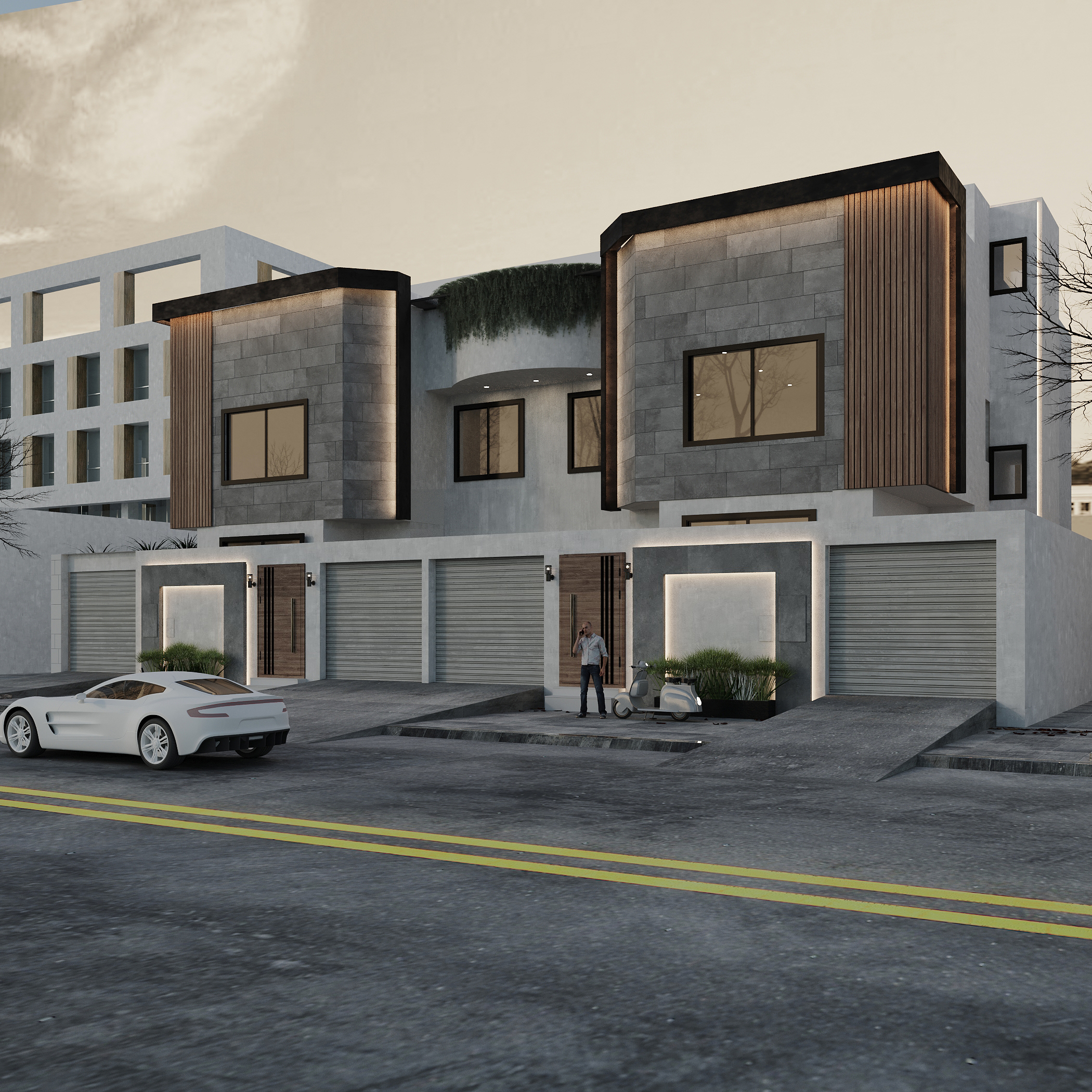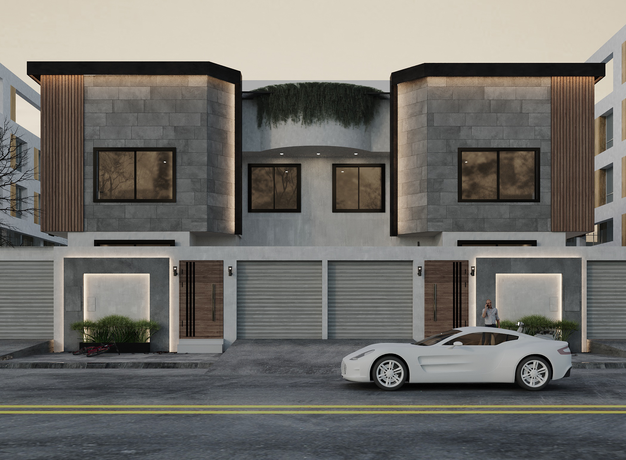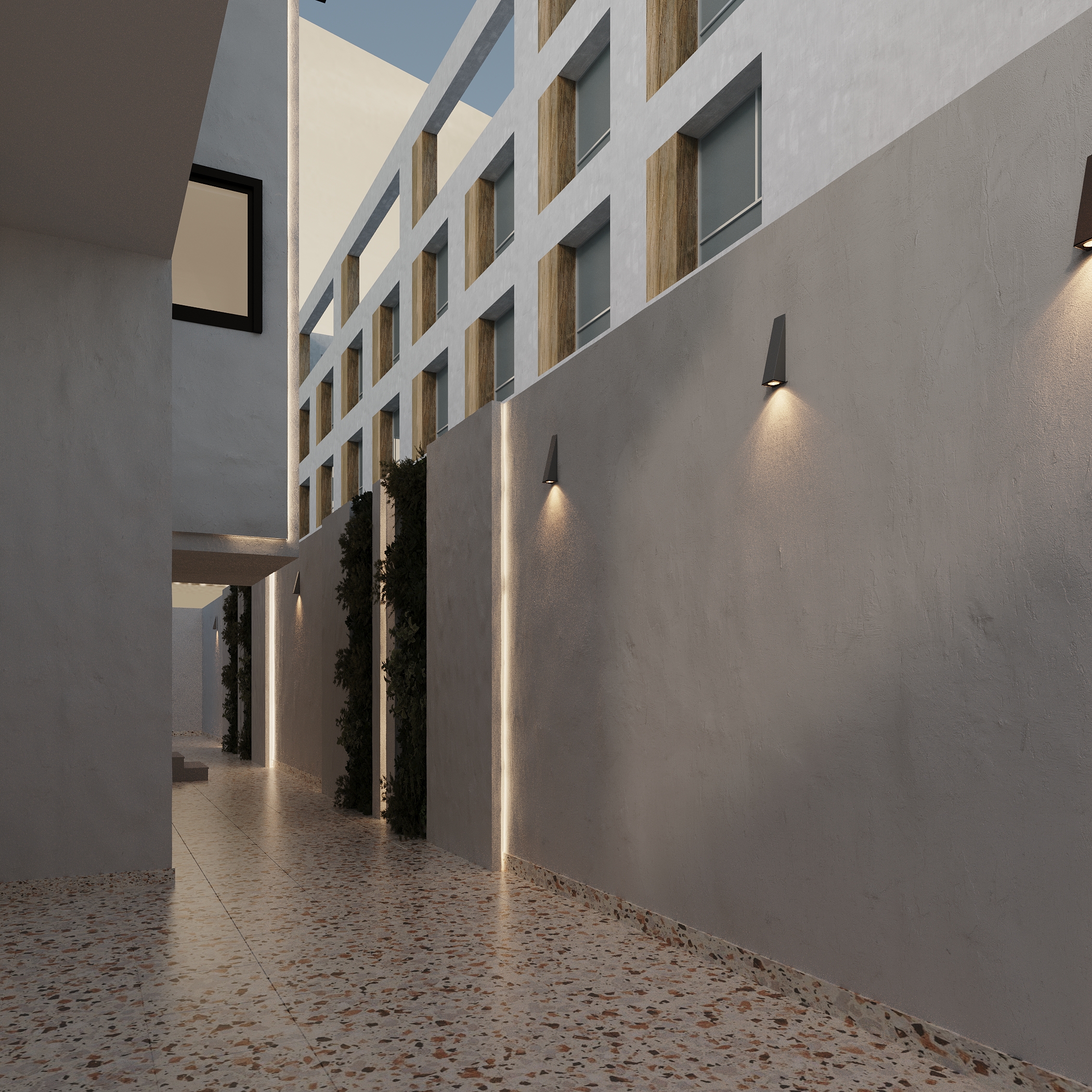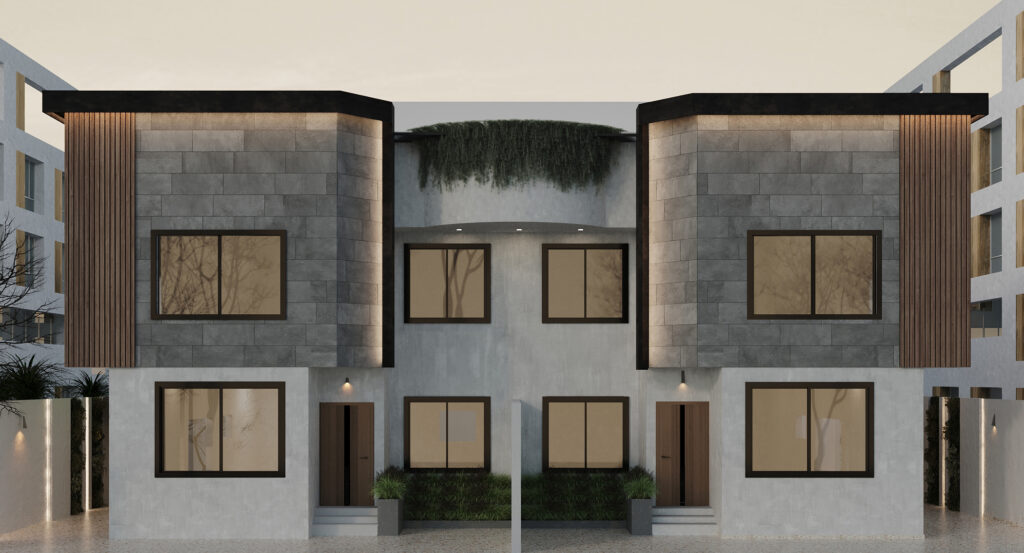 We designed our facade in a modern style. We used clear and regular geometric shapes, such as squares, to reinforce the modern look. We chose neutral colors for the materials. We used white-painted concrete combined with dark gray colors, and wood for the gates and details to create contrast on the facade. The symmetry in this facade was clear to give a sense of balance. We also added hidden lighting for more beauty at night, and lighting at the planters to highlight them. The green spaces above the facade with the planters were to promote sustainability in general. Also, in the interior images, we included plant elements to enhance sustainability along with lighting to complete the space at night and give more beauty and clarity to the design. The gate was made of wood in a distinctive way, and we tried to make it as high as possible to give a sense of welcome.